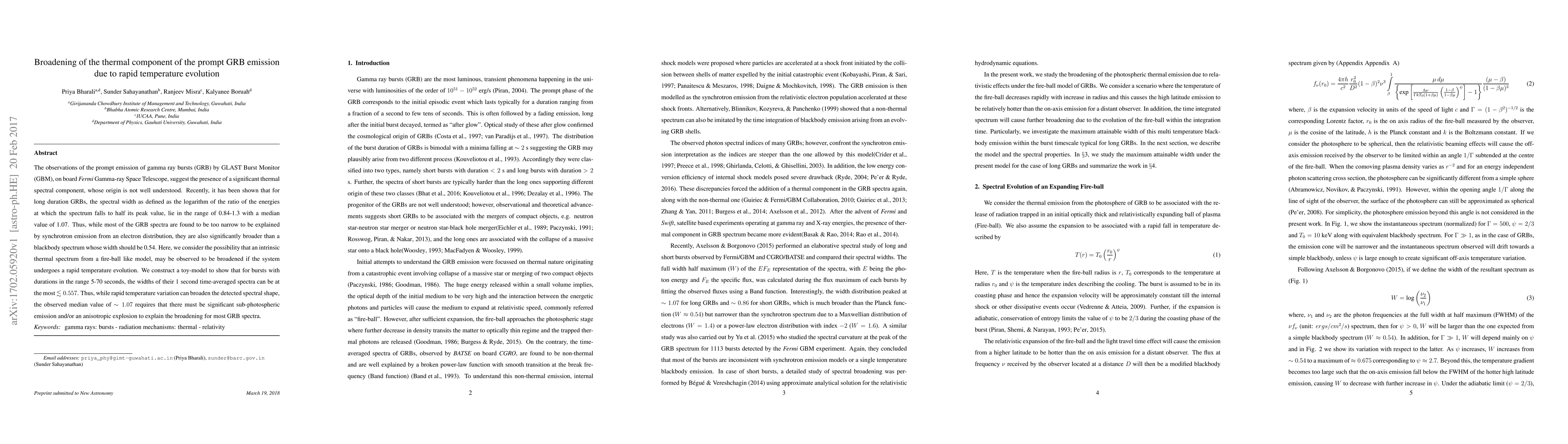 The observations of the prompt emission of gamma ray bursts (GRB) by GLAST Burst Monitor (GBM), on board Fermi Gamma-ray Space Telescope, suggest the presence of a significant thermal spectral component, whose origin is not well understood. Recently, it has been shown that for long duration GRBs, the spectral width as defined as the logarithm of the ratio of the energies at which the spectrum falls to half its peak value, lie in the range of 0.84-1.3 with a median value of 1.07. Thus, while most of the GRB spectra are found to be too narrow to be explained by synchrotron emission from an electron distribution, they are also significantly broader than a blackbody spectrum whose width should be 0.54. Here, we consider the possibility that an intrinsic thermal spectrum from a fire-ball like model, may be observed to be broadened if the system undergoes a rapid temperature evolution. We construct a toy-model to show that for bursts with durations in the range 5-70 seconds, the widths of their 1 second time-averaged spectra can be at the most $\lesssim 0.557$. Thus, while rapid temperature variation can broaden the detected spectral shape, the observed median value of $\sim 1.07$ requires that there must be significant sub-photospheric emission and/or an anisotropic explosion to explain the broadening for most GRB spectra.