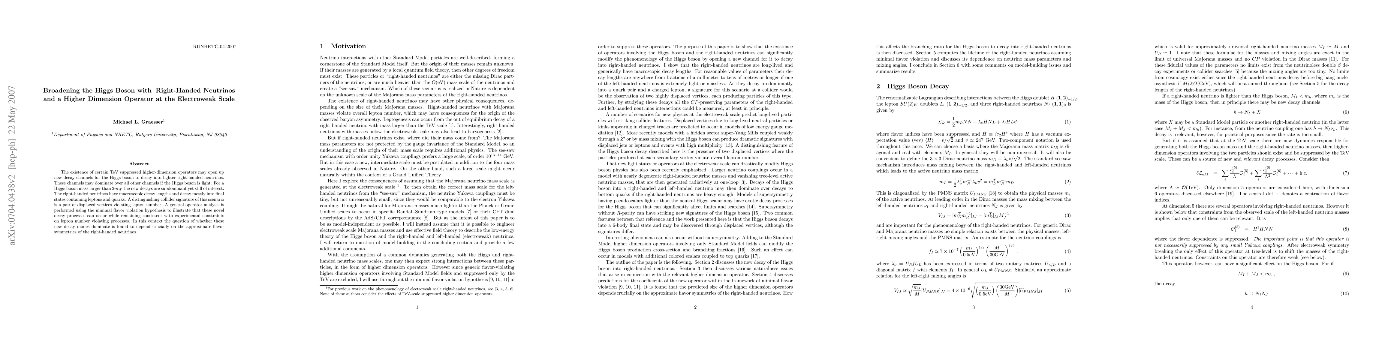 The existence of certain TeV suppressed higher-dimension operators may open up new decay channels for the Higgs boson to decay into lighter right-handed neutrinos. These channels may dominate over all other channels if the Higgs boson is light. For a Higgs boson mass larger than $2 m_W$ the new decays are subdominant yet still of interest. The right-handed neutrinos have macroscopic decay lengths and decay mostly into final states containing leptons and quarks. A distinguishing collider signature of this scenario is a pair of displaced vertices violating lepton number. A general operator analysis is performed using the minimal flavor violation hypothesis to illustrate that these novel decay processes can occur while remaining consistent with experimental constraints on lepton number violating processes. In this context the question of whether these new decay modes dominate is found to depend crucially on the approximate flavor symmetries of the right-handed neutrinos.