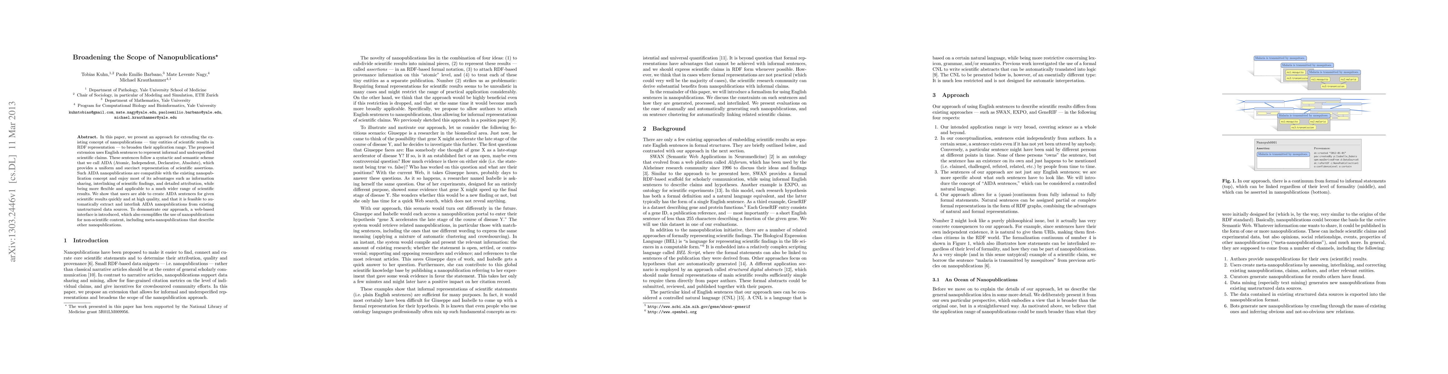 In this paper, we present an approach for extending the existing concept of nanopublications --- tiny entities of scientific results in RDF representation --- to broaden their application range. The proposed extension uses English sentences to represent informal and underspecified scientific claims. These sentences follow a syntactic and semantic scheme that we call AIDA (Atomic, Independent, Declarative, Absolute), which provides a uniform and succinct representation of scientific assertions. Such AIDA nanopublications are compatible with the existing nanopublication concept and enjoy most of its advantages such as information sharing, interlinking of scientific findings, and detailed attribution, while being more flexible and applicable to a much wider range of scientific results. We show that users are able to create AIDA sentences for given scientific results quickly and at high quality, and that it is feasible to automatically extract and interlink AIDA nanopublications from existing unstructured data sources. To demonstrate our approach, a web-based interface is introduced, which also exemplifies the use of nanopublications for non-scientific content, including meta-nanopublications that describe other nanopublications.