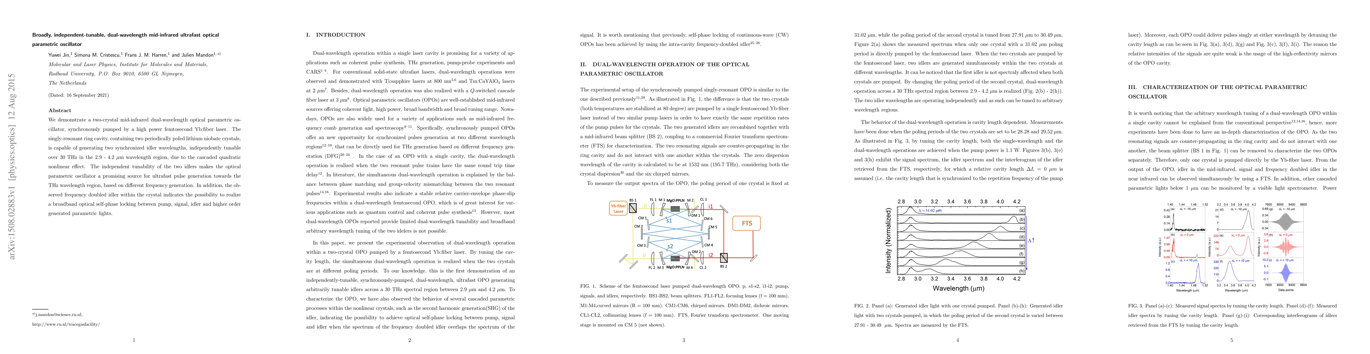 This paper presents a two-crystal mid-infrared optical parametric oscillator, pumped by a femtosecond Yb:fiber laser, capable of generating two independently tunable idler wavelengths over 30 THz in the 2.9 - 4.2 μm range. The system's potential for ultrafast pulse generation and broadband optical self-phase locking is highlighted.
