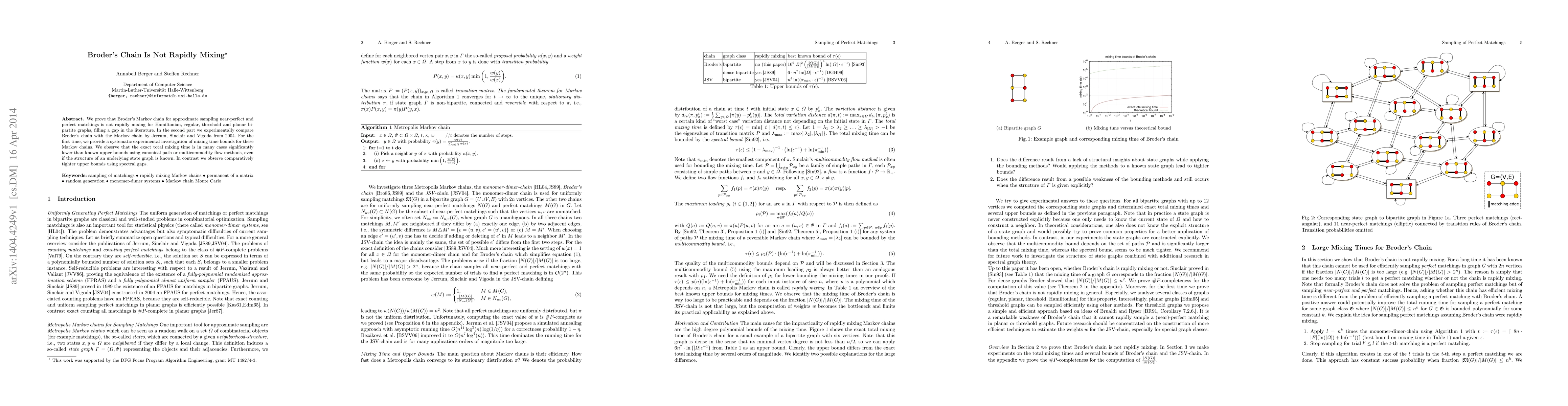 This paper demonstrates that Broder's Markov chain for sampling matchings is not rapidly mixing for several graph types, filling a literature gap. Experimentally, it compares Broder's chain to another Markov chain, finding that exact mixing times often outperform theoretical upper bounds, though spectral gaps provide tighter approximations.