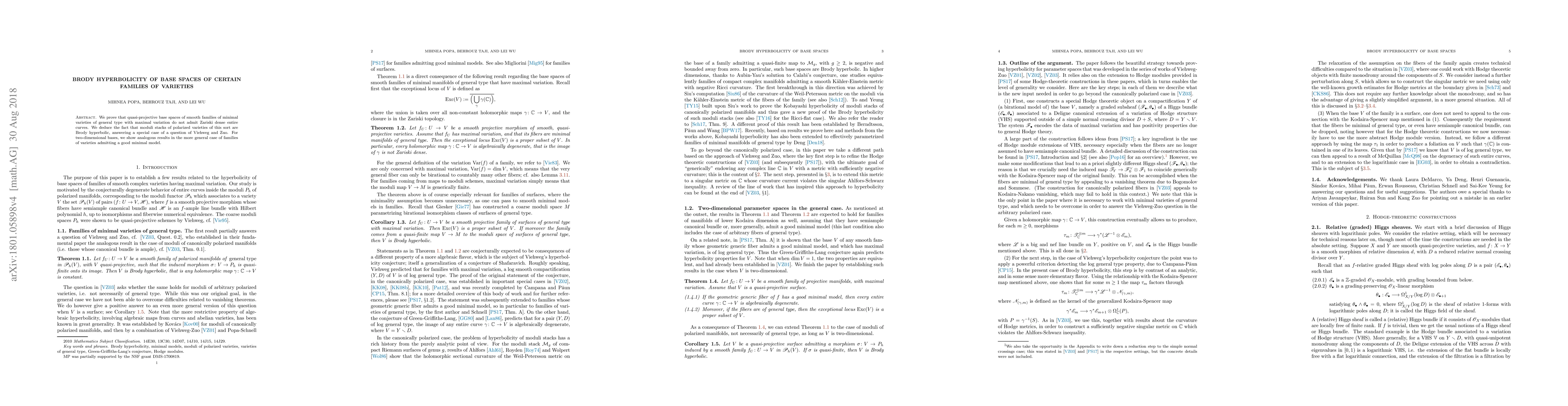 This paper proves that quasi-projective base spaces of smooth families of minimal varieties of general type with maximal variation do not contain Zariski dense entire curves, leading to the conclusion that the corresponding moduli stacks are Brody hyperbolic. The results extend to two-dimensional bases in the context of families with good minimal models.