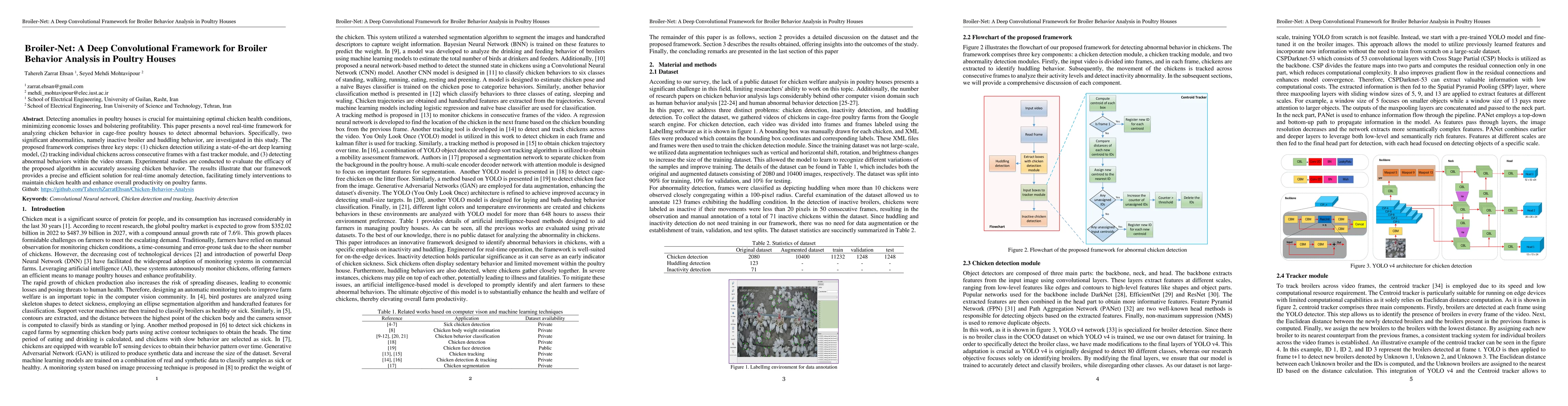 This paper introduces a deep convolutional framework named Broiler-Net for real-time detection of abnormal behaviors in cage-free poultry houses, focusing on inactive broiler and huddling behavior. The framework employs a deep learning model for chicken detection, a tracker for individual behavior monitoring, and an algorithm for behavior anomaly detection, demonstrating high accuracy in maintaining chicken health and farm productivity.
