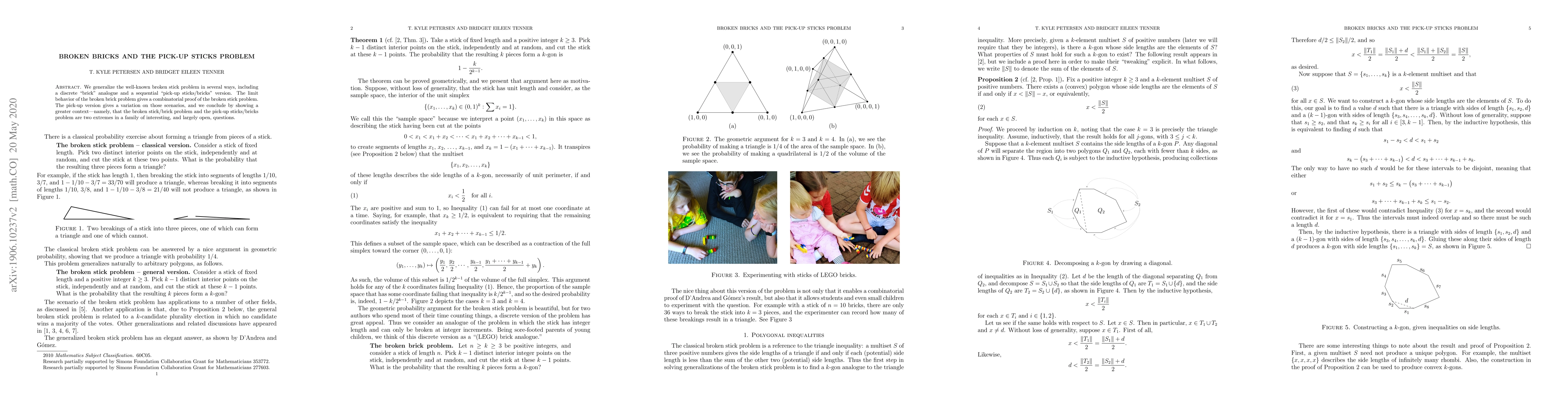 We generalize the well-known broken stick problem in several ways, including a discrete "brick" analogue and a sequential "pick-up sticks/bricks" version. The limit behavior of the broken brick problem gives a combinatorial proof of the broken stick problem. The pick-up version gives a variation on those scenarios, and we conclude by showing a greater context---namely, that the broken stick/brick problem and the pick-up sticks/bricks problem are two extremes in a family of interesting, and largely open, questions.