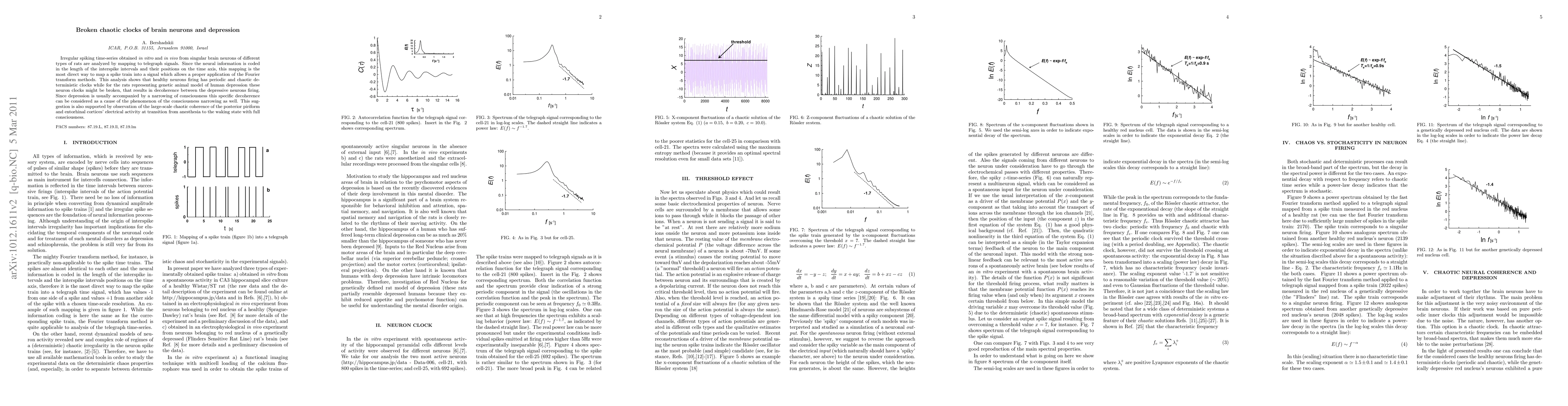 Irregular spiking time-series obtained in vitro and in vivo from singular brain neurons of different types of rats are analyzed by mapping to telegraph signals. Since the neural information is coded in the length of the interspike intervals and their positions on the time axis, this mapping is the most direct way to map a spike train into a signal which allows a proper application of the Fourier transform methods. This analysis shows that healthy neurons firing has periodic and chaotic deterministic clocks while for the rats representing genetic animal model of human depression these neuron clocks might be broken, that results in decoherence between the depressive neurons firing. Since depression is usually accompanied by a narrowing of consciousness this specific decoherence can be considered as a cause of the phenomenon of the consciousness narrowing as well. This suggestion is also supported by observation of the large-scale chaotic coherence of the posterior piriform and entorhinal cortices' electrical activity at transition from anesthesia to the waking state with full consciousness.