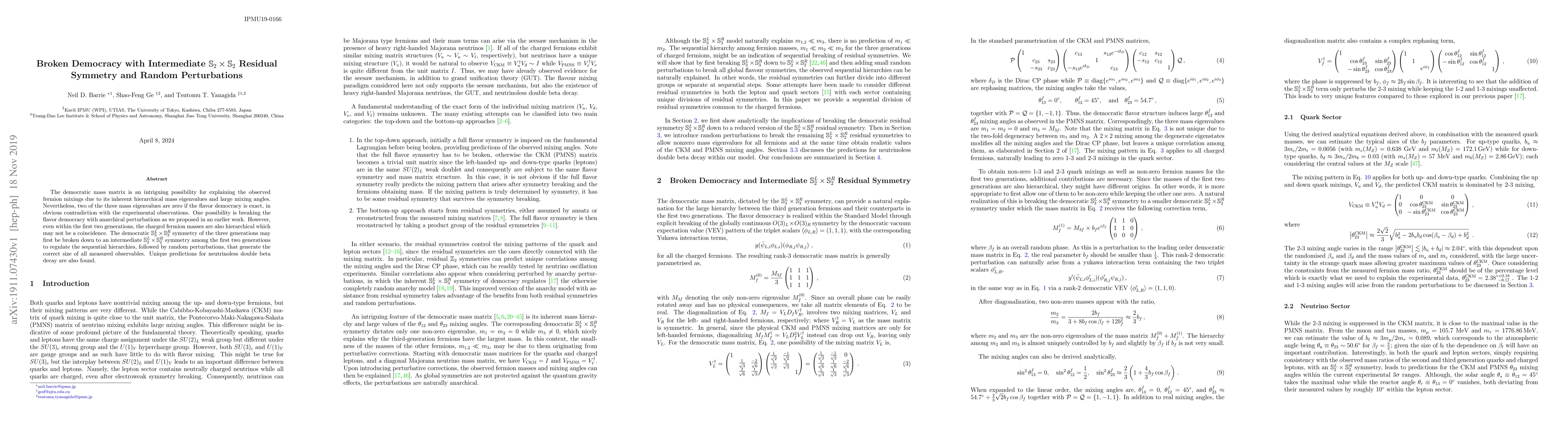 The democratic mass matrix is an intriguing possibility for explaining the observed fermion mixings due to its inherent hierarchical mass eigenvalues and large mixing angles. Nevertheless, two of the three mass eigenvalues are zero if the flavor democracy is exact, in obvious contradiction with the experimental observations. One possibility is breaking the flavor democracy with anarchical perturbations as we proposed in an earlier work. However, even within the first two generations, the charged fermion masses are also hierarchical which may not be a coincidence. The democratic $\mathbb S^L_3 \times \mathbb S^R_3$ symmetry of the three generations may first be broken down to an intermediate $\mathbb S^L_2 \times \mathbb S^R_2$ symmetry among the first two generations to regulate the sequential hierarchies, followed by random perturbations, that generate the correct size of all measured observables. Unique predictions for neutrinoless double beta decay are also found.