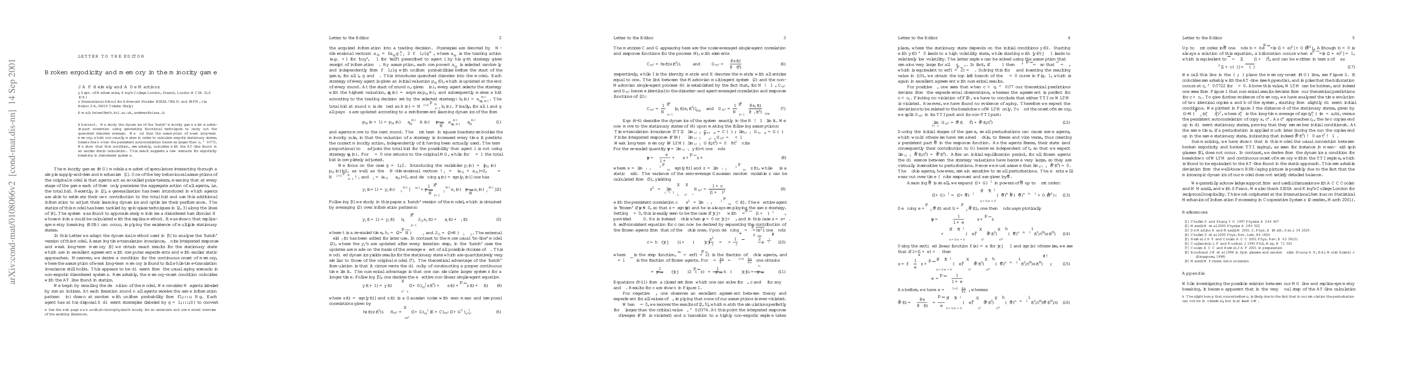 We study the dynamics of the `batch' minority game with market-impact correction using generating functional techniques to carry out the quenched disorder average. We find that the assumption of weak long-term memory, which one usually makes in order to calculate ergodic stationary states, breaks down when the persistent autocorrelation becomes larger than c_c=0.772... We show that this condition, remarkably, coincides with the AT-line found in an earlier static calculation. This result suggests a new scenario for ergodicity breaking in disordered systems.
