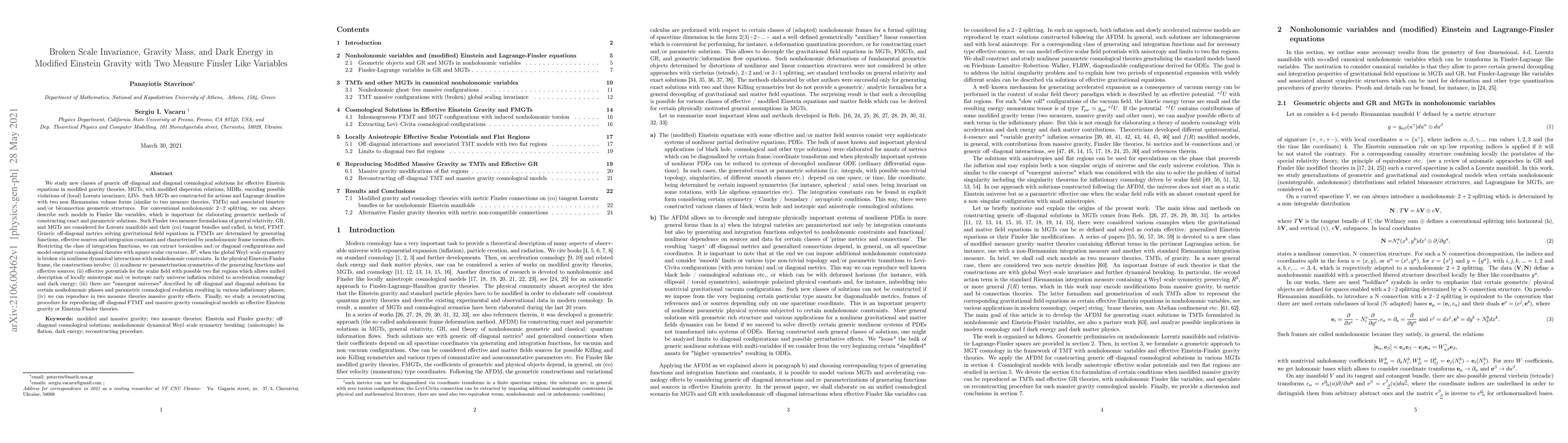 We study new classes of generic off-diagonal and diagonal cosmological solutions for effective Einstein equations in modified gravity theories, MGTs, with modified dispersion relations, MDRs, encoding possible violations of (local) Lorentz invariance, LIVs. Such MGTs are constructed for Lagrange densities with two non-Riemannian volume forms (two-measure theories, TMTs) and associated bimetric/ biconnection geometric structures. For conventional 2+2 splitting, we can describe such models in Finsler like variables, which is important for elaborating geometric methods of constructing exact and parametric solutions. Such formulations of general relativity, GR, and MGTs are considered for Lorentz manifolds and their (co) tangent bundles, in brief, FTMT. Off-diagonal metrics solving gravitational field equations in FTMTs are determined by generating functions, effective sources and integration constants and characterized by nonholonomic frame torsion effects. Restricting the class of integration functions, we can extract torsionless and diagonal configurations and model emergent cosmological theories with square scalar curvature, $R^2$, when the global Weyl-scale symmetry is broken via nonlinear dynamical interactions with nonholonomic constraints. In the physical Einstein-Finsler frame, the constructions involve (i) nonlinear re-parametrization symmetries of the generating functions and effective sources; (ii) effective potentials for the scalar field with possible two flat regions which allows a unified description of locally anisotropic and/or isotropic early universe inflation related to acceleration cosmology and dark energy; (iii) there are "emergent universes" described by (off-) diagonal solutions for certain nonholonomic phases and parametric cosmological evolution resulting in various inflationary phases; (iv) we can reproduce in two-measure theories massive gravity effects.