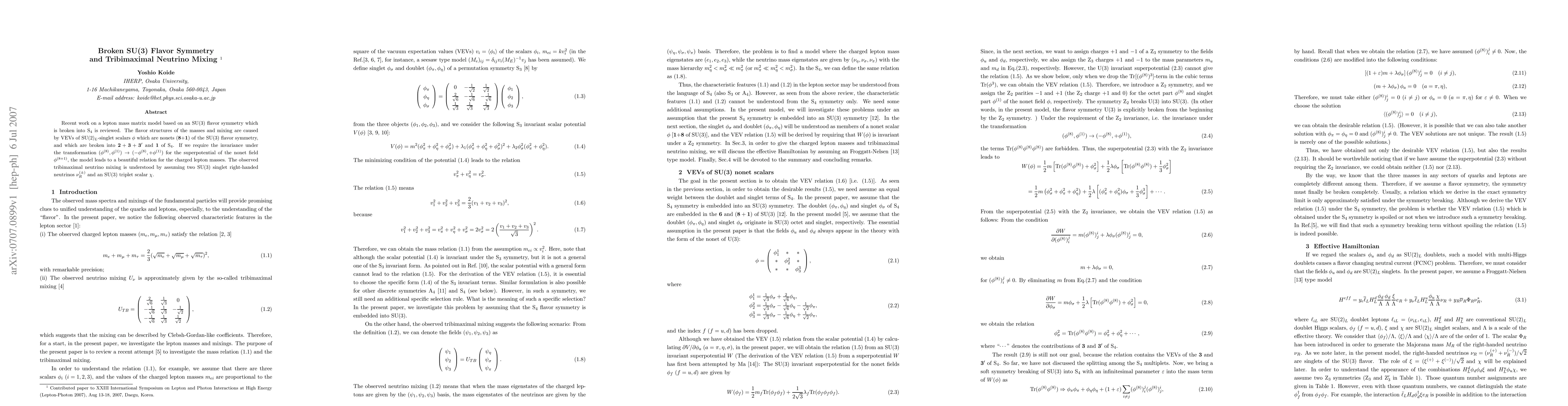 Recent work on a lepton mass matrix model based on an SU(3) flavor symmetry which is broken into S_4 is reviewed. The flavor structures of the masses and mixing are caused by VEVs of SU(2)_L-singlet scalars \phi which are nonets ({\bf 8}+{\bf 1}) of the SU(3) flavor symmetry, and which are broken into {\bf 2}+{\bf 3}+{\bf 3}' and {\bf 1} of S_4. If we require the invariance under the transformation (\phi^{(8)},\phi^{(1)}) \to (-\phi^{(8)},+\phi^{(1)}) for the superpotential of the nonet field \phi^{(8+1)}, the model leads to a beautiful relation for the charged lepton masses. The observed tribimaximal neutrino mixing is understood by assuming two SU(3) singlet right-handed neutrinos \nu_R^{(\pm)} and an SU(3) triplet scalar \chi.