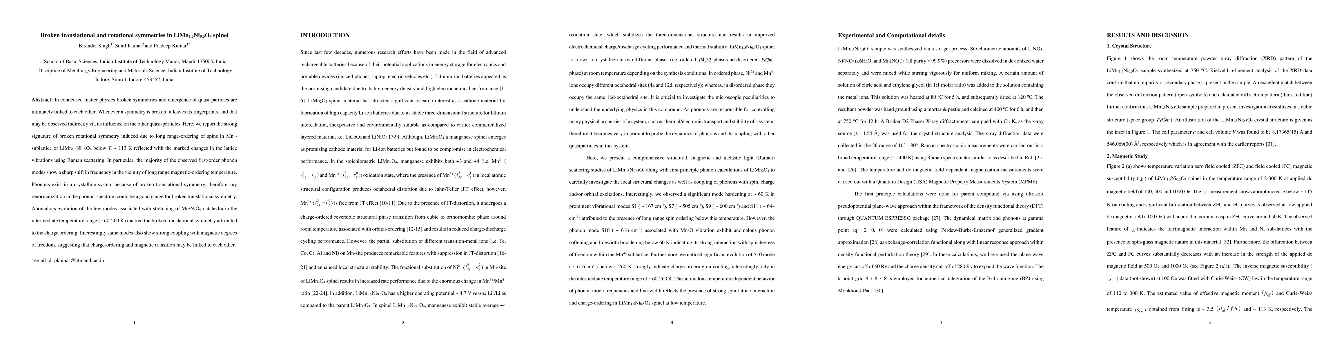 This study reveals the signatures of broken rotational and translational symmetries in LiMn1.5Ni0.5O4 spinel via Raman scattering, showing marked phonon frequency shifts below the magnetic ordering temperature and anomalous phonon modes in the intermediate temperature range, indicating a coupling between charge ordering and magnetic transitions.