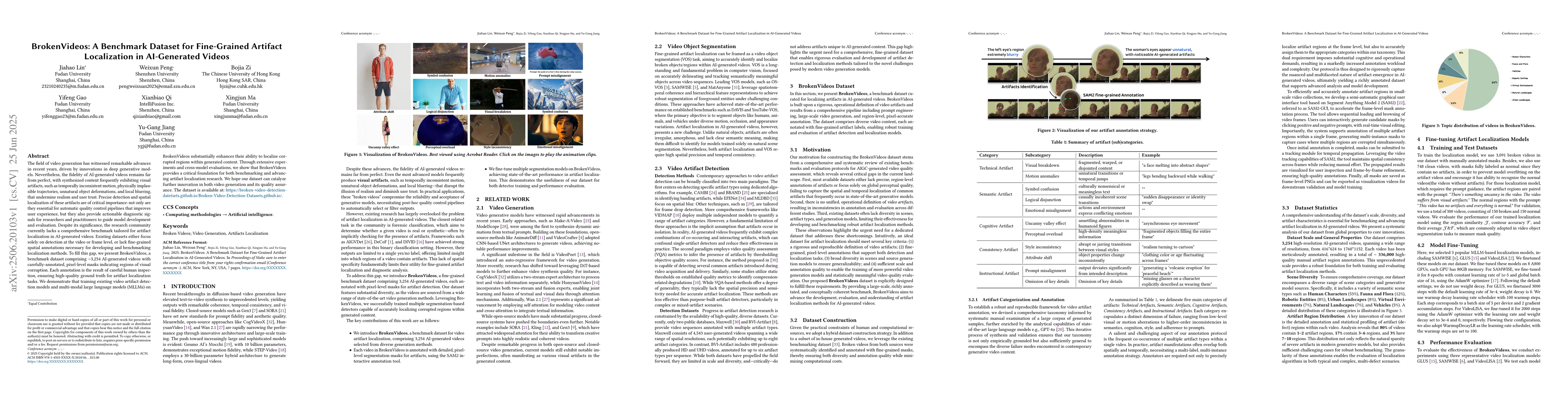 Recent advances in deep generative models have led to significant progress in video generation, yet the fidelity of AI-generated videos remains limited. Synthesized content often exhibits visual artifacts such as temporally inconsistent motion, physically implausible trajectories, unnatural object deformations, and local blurring that undermine realism and user trust. Accurate detection and spatial localization of these artifacts are crucial for both automated quality control and for guiding the development of improved generative models. However, the research community currently lacks a comprehensive benchmark specifically designed for artifact localization in AI generated videos. Existing datasets either restrict themselves to video or frame level detection or lack the fine-grained spatial annotations necessary for evaluating localization methods. To address this gap, we introduce BrokenVideos, a benchmark dataset of 3,254 AI-generated videos with meticulously annotated, pixel-level masks highlighting regions of visual corruption. Each annotation is validated through detailed human inspection to ensure high quality ground truth. Our experiments show that training state of the art artifact detection models and multi modal large language models (MLLMs) on BrokenVideos significantly improves their ability to localize corrupted regions. Through extensive evaluation, we demonstrate that BrokenVideos establishes a critical foundation for benchmarking and advancing research on artifact localization in generative video models. The dataset is available at: https://broken-video-detection-datetsets.github.io/Broken-Video-Detection-Datasets.github.io/.