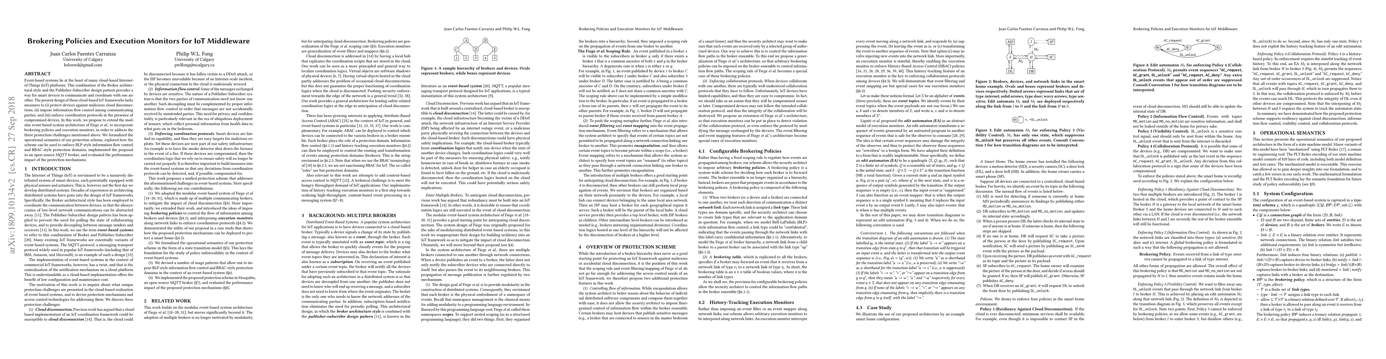 This paper proposes extending modular event-based IoT middleware with brokering policies and execution monitors to protect against malicious disconnections, enforce information flow control, and secure coordination protocols. The proposed scheme was formalized, implemented in an open-source MQTT broker, and evaluated for performance impact.