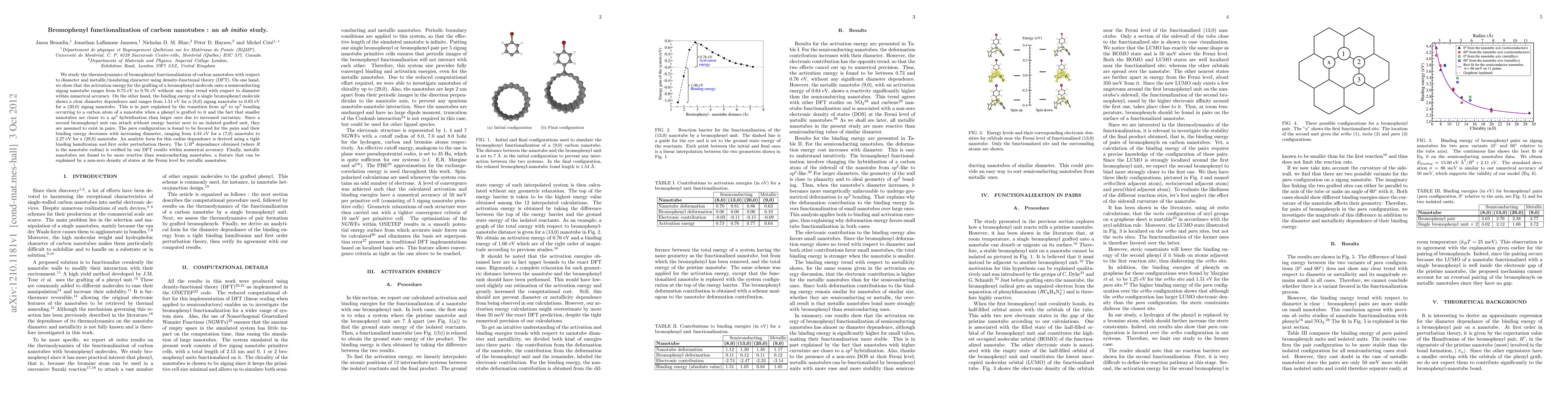 This study utilizes density-functional theory to analyze the thermodynamics of bromophenyl functionalization on carbon nanotubes, revealing activation and binding energies that vary with nanotube diameter and character, with metallic nanotubes exhibiting higher reactivity.