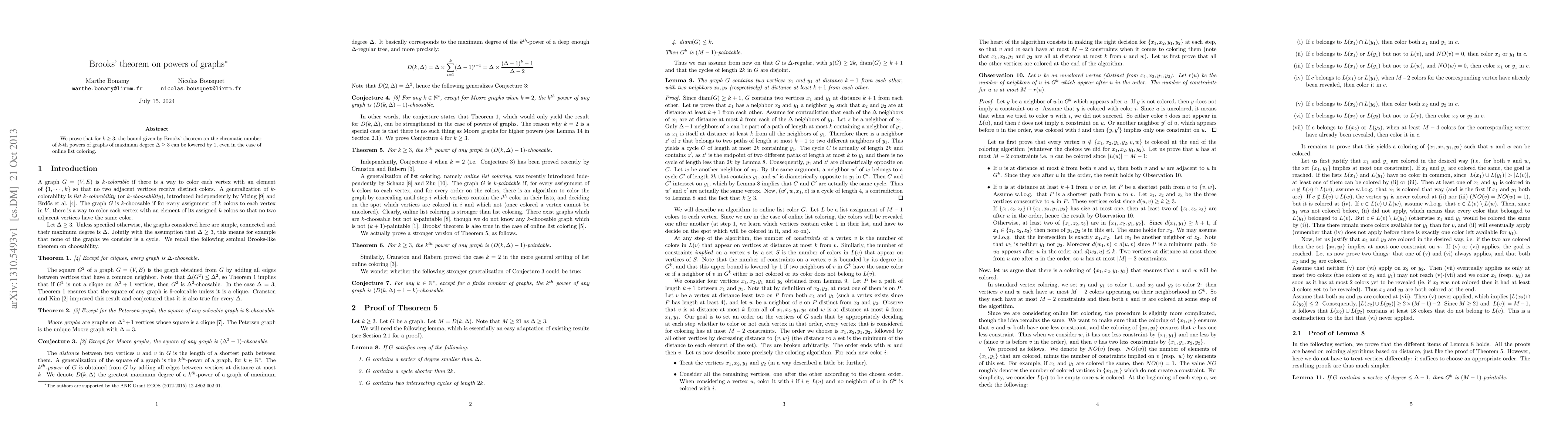 Brooks' theorem on powers of graphs demonstrates that for $k\geq 3$, the chromatic number of $k$-th powers of graphs with maximum degree $\Delta \geq 3$ can be reduced by 1, even under online list coloring conditions. This refines the original theorem's bounds.