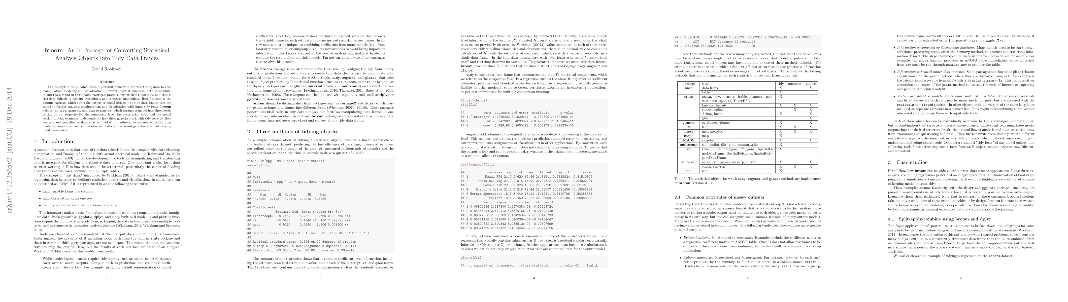 The broom R package converts statistical analysis objects into tidy data frames, facilitating easier manipulation, modeling, and visualization. It provides "tidy," "augment," and "glance" generics for output at component, observation, and model levels, respectively.