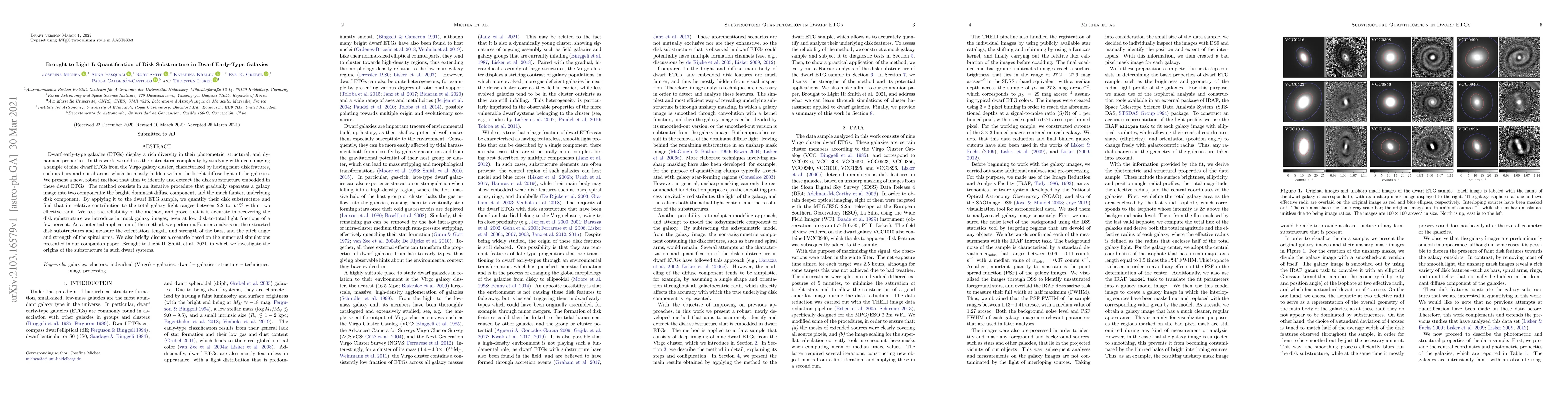 This paper introduces a new method to quantify disk substructure in faint features of nine dwarf early-type galaxies from the Virgo cluster, revealing that these substructures contribute 2.2 to 6.4% of the total galaxy light within two effective radii. The method accurately recovers disk substructures even in low-contrast scenarios, and its application includes a Fourier analysis to measure the characteristics of bars and spiral arms.