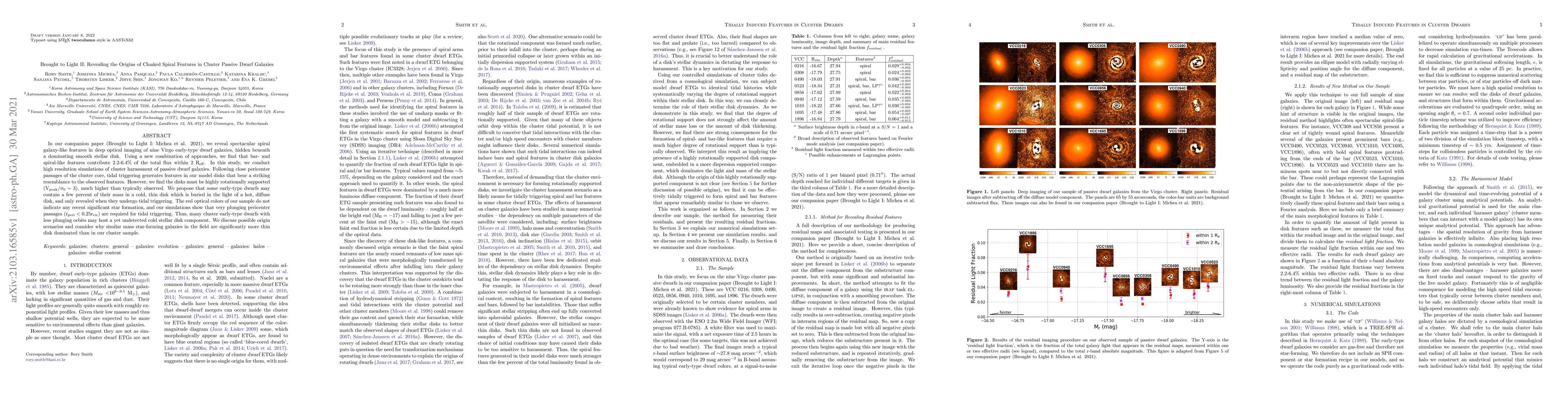 In our companion paper (Brought to Light I: Michea et al. 2021), we reveal spectacular spiral galaxy-like features in deep optical imaging of nine Virgo early-type dwarf galaxies, hidden beneath a dominating smooth stellar disk. Using a new combination of approaches, we find that bar- and spiral-like features contribute 2.2-6.4% of the total flux within 2 R$_{\rm{eff}}$. In this study, we conduct high resolution simulations of cluster harassment of passive dwarf galaxies. Following close pericenter passages of the cluster core, tidal triggering generates features in our model disks that bear a striking resemblance to the observed features. However, we find the disks must be highly rotationally supported (V$_{\rm{peak}}/\sigma_0 \sim 3$), much higher than typically observed. We propose that some early-type dwarfs may contain a few percent of their mass in a cold, thin disk which is buried in the light of a hot, diffuse disk, and only revealed when they undergo tidal triggering. The red optical colors of our sample do not indicate any recent significant star formation, and our simulations show that very plunging pericenter passages (r$_{\rm{peri}}<0.25$r$_{\rm{vir}}$) are required for tidal triggering. Thus, many cluster early-type dwarfs with less plunging orbits may host a yet undetected cold stellar disk component. We discuss possible origin scenarios and consider why similar mass star-forming galaxies in the field are significantly more thin disk dominated than in our cluster sample.