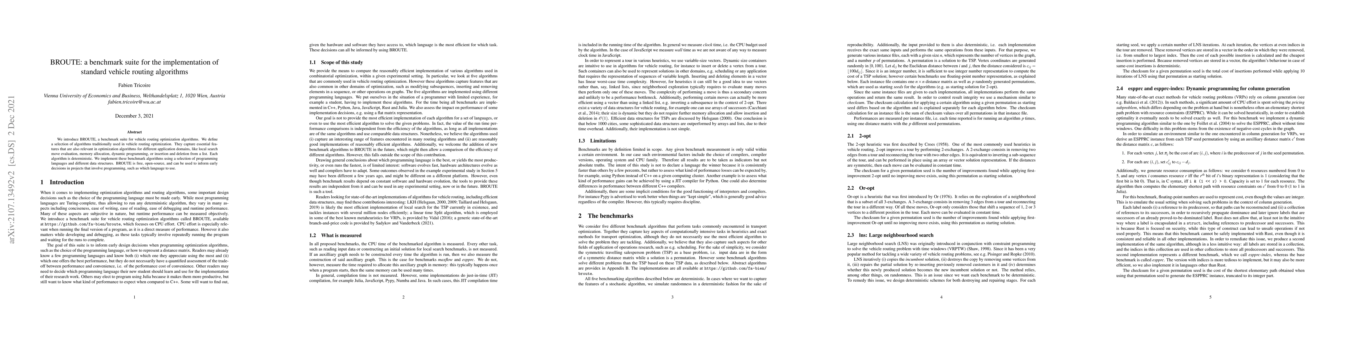 BROUTE is introduced as a benchmark suite for vehicle routing optimization algorithms, implementing traditional algorithms in various programming languages and data structures to evaluate performance and inform early project decisions such as language choice.