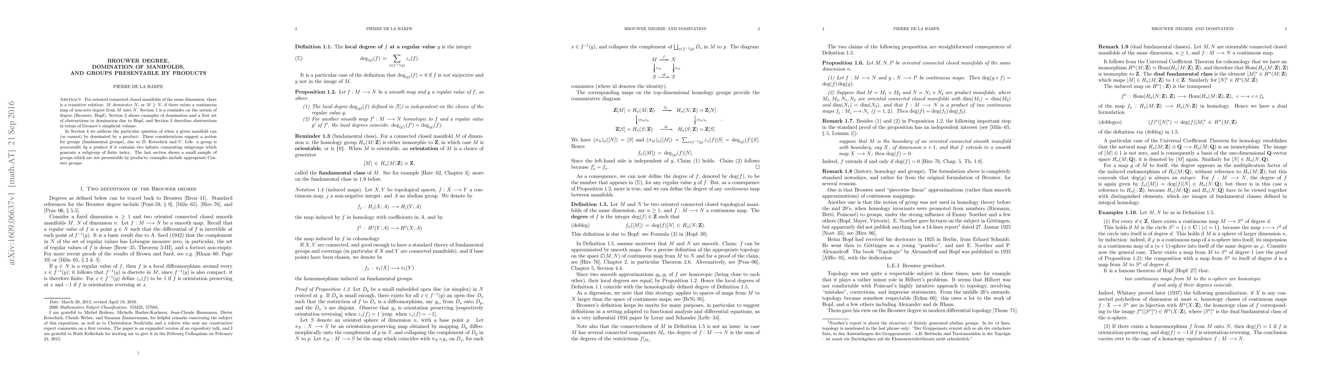 For oriented connected closed manifolds of the same dimension, there is a transitive relation: $M$ dominates $N$, or $M \ge N$, if there exists a continuous map of non-zero degree from $M$ onto $N$. Section 1 is a reminder on the notion of degree (Brouwer, Hopf), Section 2 shows examples of domination and a first set of obstructions to domination due to Hopf, and Section 3 describes obstructions in terms of Gromov's simplicial volume. In Section 4 we address the particular question of when a given manifold can (or cannot) be dominated by a product. These considerations suggest a notion for groups (fundamental groups), due to D. Kotschick and C. L\"oh: a group is presentable by a product if it contains two infinite commuting subgroups which generate a subgroup of finite index. The last section shows a small sample of groups which are not presentable by products; examples include appropriate Coxeter groups.