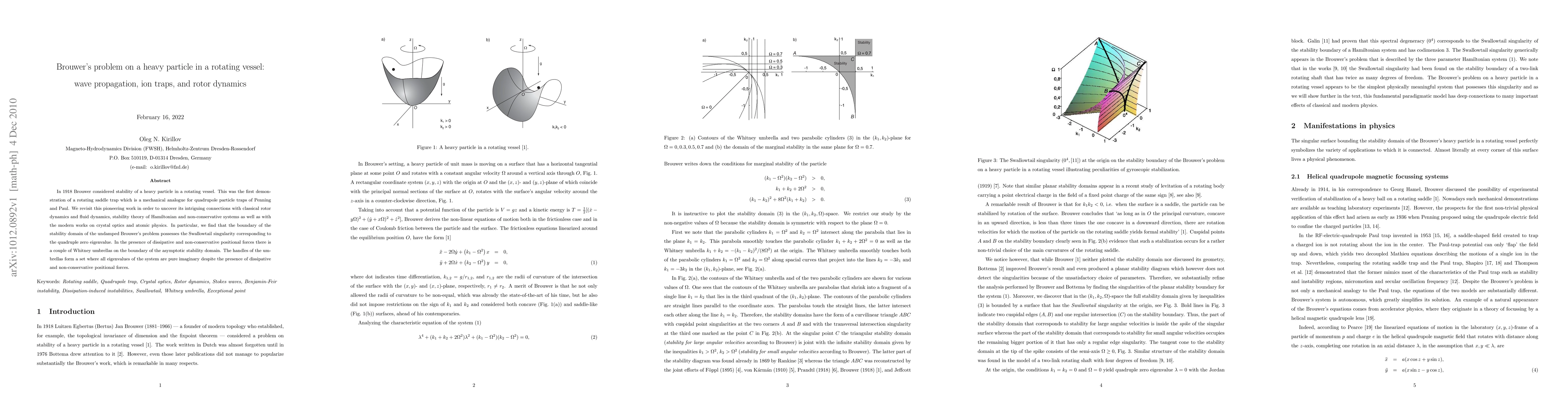 In 1918 Brouwer considered stability of a heavy particle in a rotating vessel. This was the first demonstration of a rotating saddle trap which is a mechanical analogue for quadrupole particle traps of Penning and Paul. We revisit this pioneering work in order to uncover its intriguing connections with classical rotor dynamics and fluid dynamics, stability theory of Hamiltonian and non-conservative systems as well as with the modern works on crystal optics and atomic physics. In particular, we find that the boundary of the stability domain of the undamped Brouwer's problem possesses the Swallowtail singularity corresponding to the quadruple zero eigenvalue. In the presence of dissipative and non-conservative positional forces there is a couple of Whitney umbrellas on the boundary of the asymptotic stability domain. The handles of the umbrellas form a set where all eigenvalues of the system are pure imaginary despite the presence of dissipative and non-conservative positional forces.