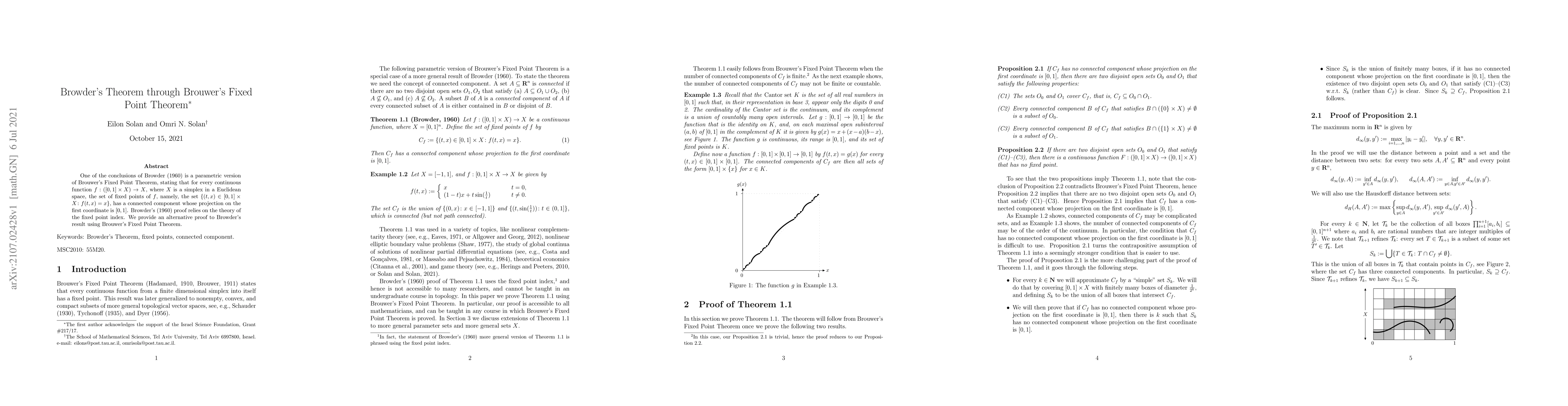 This paper presents an alternative proof for Browder's 1960 parametric version of Brouwer's Fixed Point Theorem using Brouwer's Fixed Point Theorem instead of the theory of the fixed point index. The result guarantees that for any continuous function mapping a simplex in Euclidean space, a connected component of its fixed points projects onto the interval [0,1].
