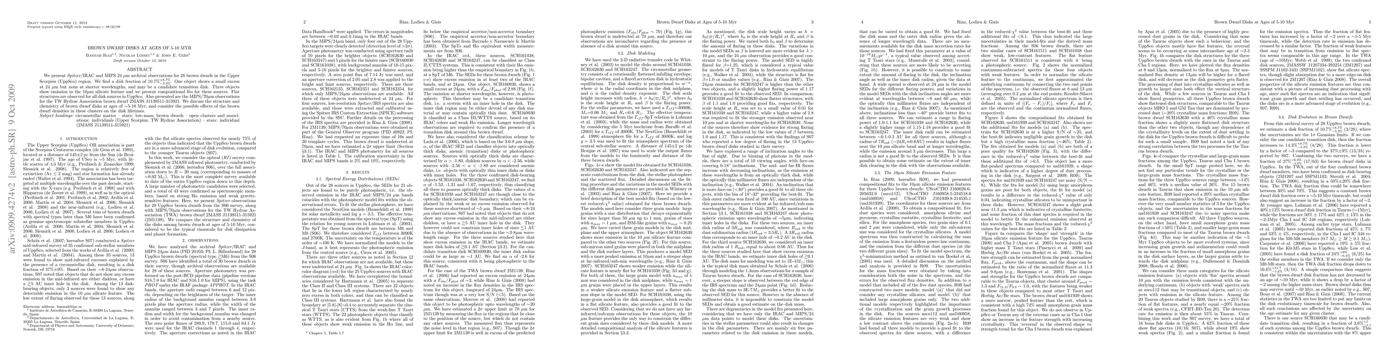We present Spitzer/IRAC and MIPS 24mu archival observations for 28 brown dwarfs in the Upper Scorpius (UppSco) region. We find a disk fraction of 10.7%^(+8.7%)_(-3.3%). One object shows a small excess at 24mu but none at shorter wavelengths, and may be a candidate transition disk. Three objects show emission in the 10mu silicate feature and we present compositional fits for these sources. Flat structures are observed for all disk sources in UppSco. Also presented are the MIPS/70mu observations for the TW Hydrae Association brown dwarf 2MASS J1139511-315921. We discuss the structure and chemistry of brown dwarf disks at ages of ~5-10 Myr, and consider the possible effects of the brown dwarf densities in these clusters on the disk lifetimes.