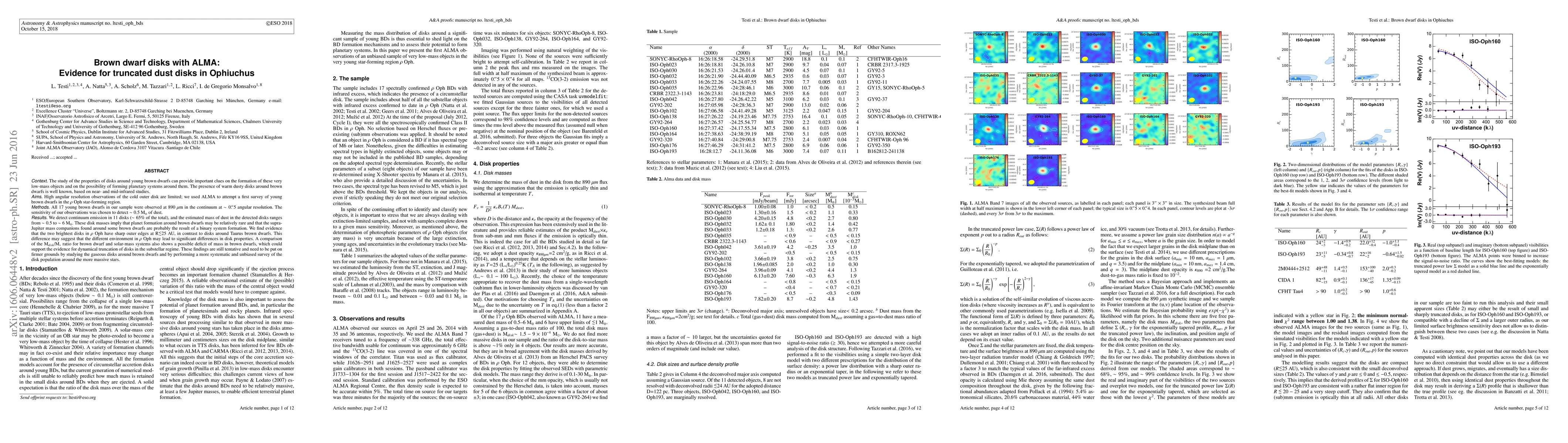 This study using ALMA observes disks around young brown dwarfs in the $\rho$-Oph region, finding that 65% have detectable dust with masses ranging from 0.5 to 6 Earth masses. Evidence suggests that these disks may be truncated, indicating rare planet formation and supporting the idea of binary system formation.