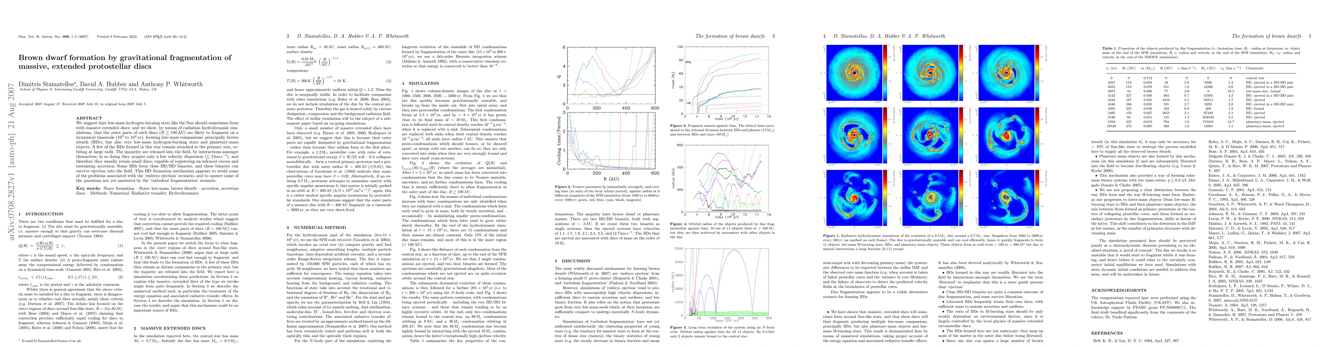 We suggest that low-mass hydrogen-burning stars like the Sun should sometimes form with massive extended discs; and we show, by means of radiation hydrodynamic simulations, that the outer parts of such discs (R>100 AU) are likely to fragment on a dynamical timescale (10^3 to $10^4 yr), forming low-mass companions: principally brown dwarfs (BDs), but also very low-mass hydrogen-burning stars and planetary-mass objects. A few of the BDs formed in this way remain attached to the primary star, orbiting at large radii. The majority are released into the field, by interactions amongst themselves; in so doing they acquire only a low velocity dispersion (<2 km/s), and therefore they usually retain small discs, capable of registering an infrared excess and sustaining accretion. Some BDs form close BD/BD binaries, and these binaries can survive ejection into the field. This BD formation mechanism appears to avoid some of the problems associated with the `embryo ejection' scenario, and to answer some of the questions not yet answered by the `turbulent fragmentation' scenario.