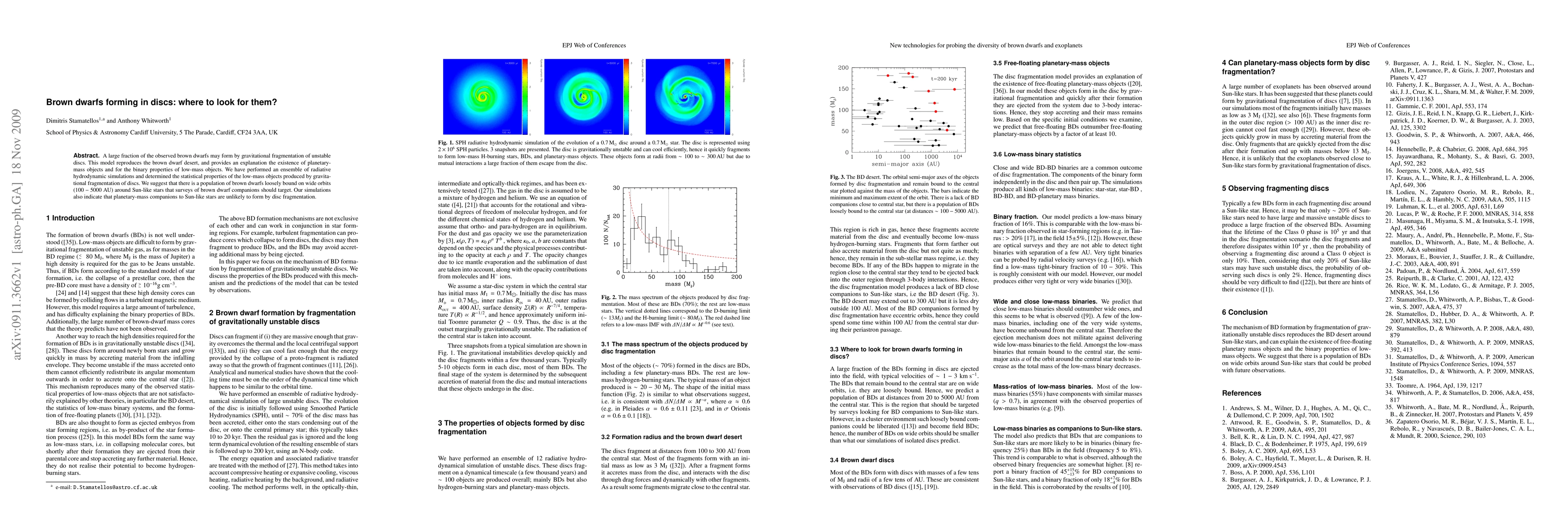 A large fraction of the observed brown dwarfs may form by gravitational fragmentation of unstable discs. This model reproduces the brown dwarf desert, and provides an explanation the existence of planetary-mass objects and for the binary properties of low-mass objects. We have performed an ensemble of radiative hydrodynamic simulations and determined the statistical properties of the low-mass objects produced by gravitational fragmentation of discs. We suggest that there is a population of brown dwarfs loosely bound on wide orbits (100-5000 AU) around Sun-like stars that surveys of brown dwarf companions should target. Our simulations also indicate that planetary-mass companions to Sun-like stars are unlikely to form by disc fragmentation.