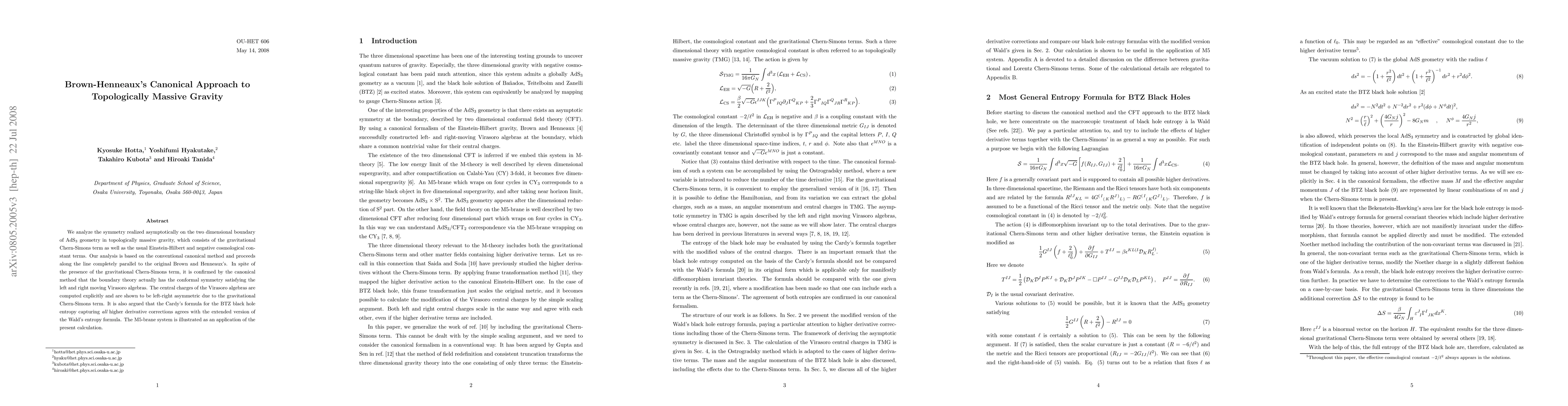 This paper employs Brown-Henneaux's canonical method to analyze the asymptotic symmetry of topologically massive gravity in AdS_3, confirming conformal symmetry with asymmetric Virasoro algebras due to the gravitational Chern-Simons term, and demonstrating agreement between Cardy's formula and the extended Wald's entropy formula for BTZ black hole entropy.