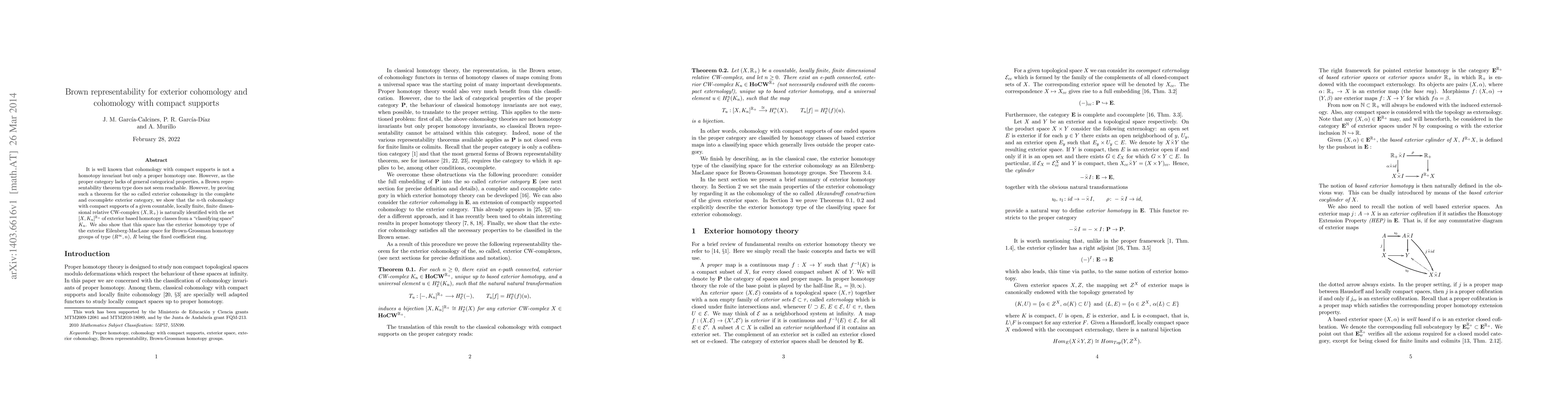 It is well known that cohomology with compact supports is not a homotopy invariant but only a proper homotopy one. However, as the proper category lacks of general categorical properties, a Brown representability theorem type does not seem reachable. However, by proving such a theorem for the so called exterior cohomology in the complete and cocomplete exterior category, we show that the $n$-th cohomology with compact supports of a given countable, locally finite, finite dimensional relative CW-complex $(X,\mathbb{R}_+)$ is naturally identified with the set $[X,K_n]^{\mathbb{R}_+}$ of exterior based homotopy classes from a "classifying space" $K_n$. We also show that this space has the exterior homotopy type of the exterior Eilenberg-MacLane space for Brown-Grossman homotopy groups of type $(R^\infty,n)$, $R$ being the fixed coefficient ring.