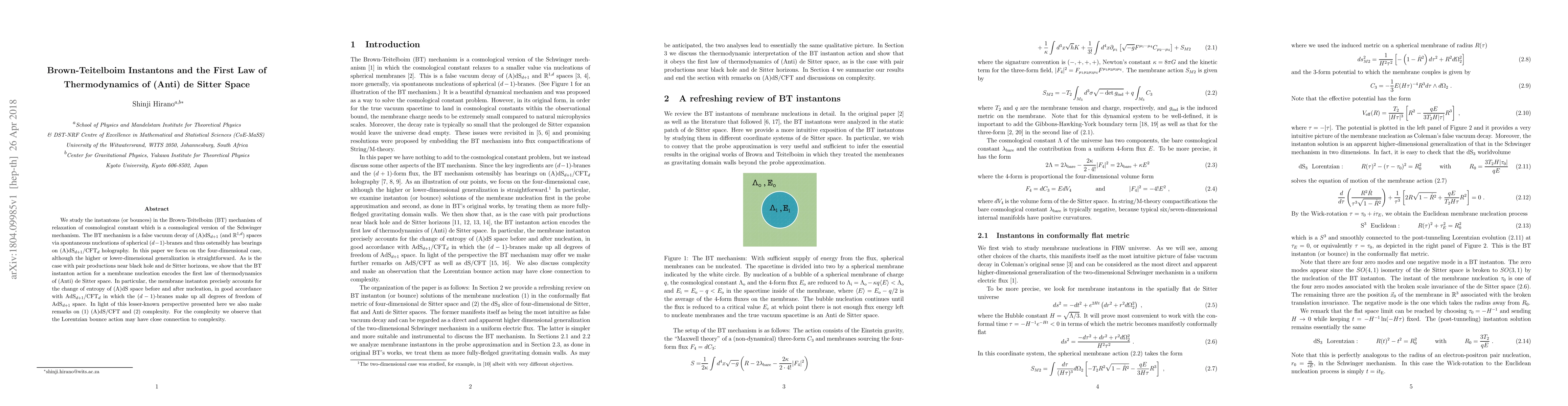 We study the instantons (or bounces) in the Brown-Teitelboim (BT) mechanism of relaxation of cosmological constant which is a cosmological version of the Schwinger mechanism. The BT mechanism is a false vacuum decay of (A)dS$_{d+1}$ (and $R^{1, d}$) spaces via spontaneous nucleations of spherical $(d-1)$-branes and thus ostensibly has bearings on (A)dS$_{d+1}$/CFT$_d$ holography. In this paper we focus on the four-dimensional case, although the higher or lower-dimensional generalization is straightforward. As is the case with pair productions near black hole and de Sitter horizons, we show that the BT instanton action for a membrane nucleation encodes the first law of thermodynamics of (Anti) de Sitter space. In particular, the membrane instanton precisely accounts for the change of entropy of (A)dS space before and after nucleation, in good accordance with AdS$_{d+1}$/CFT$_d$ in which the $(d-1)$-branes make up all degrees of freedom of AdS$_{d+1}$ space. In light of this lesser-known perspective presented here we also make remarks on (1) (A)dS/CFT and (2) complexity. For the complexity we observe that the Lorentzian bounce action may have close connection to complexity.