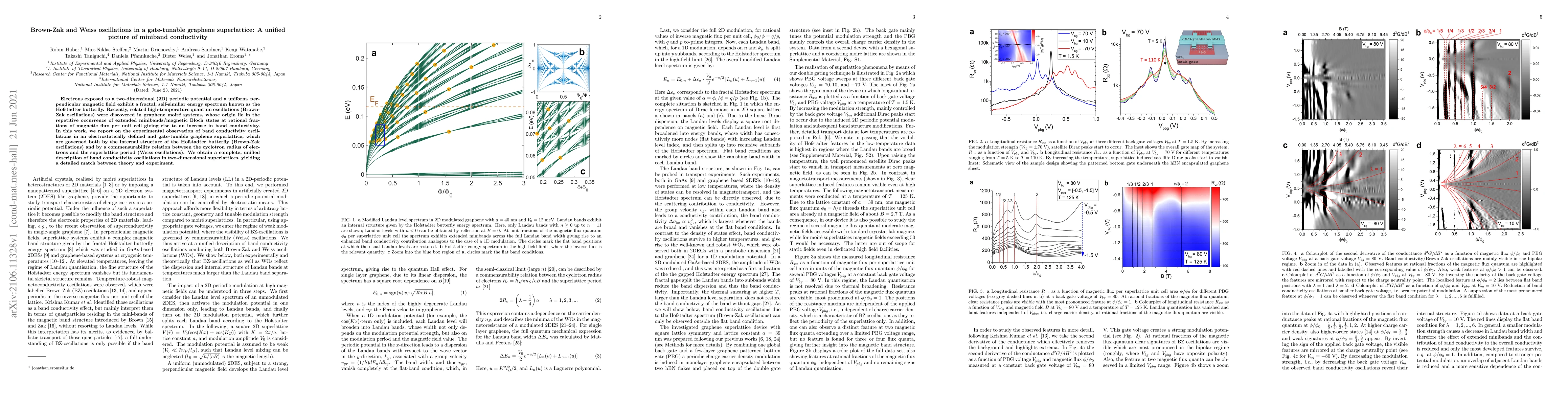 This paper reports experimental observation of Brown-Zak and Weiss oscillations in a gate-tunable graphene superlattice, revealing miniband conductivity governed by the Hofstadter butterfly and the commensurability of electron cyclotron radius and superlattice period. The study provides a unified theoretical framework matching experimental data.