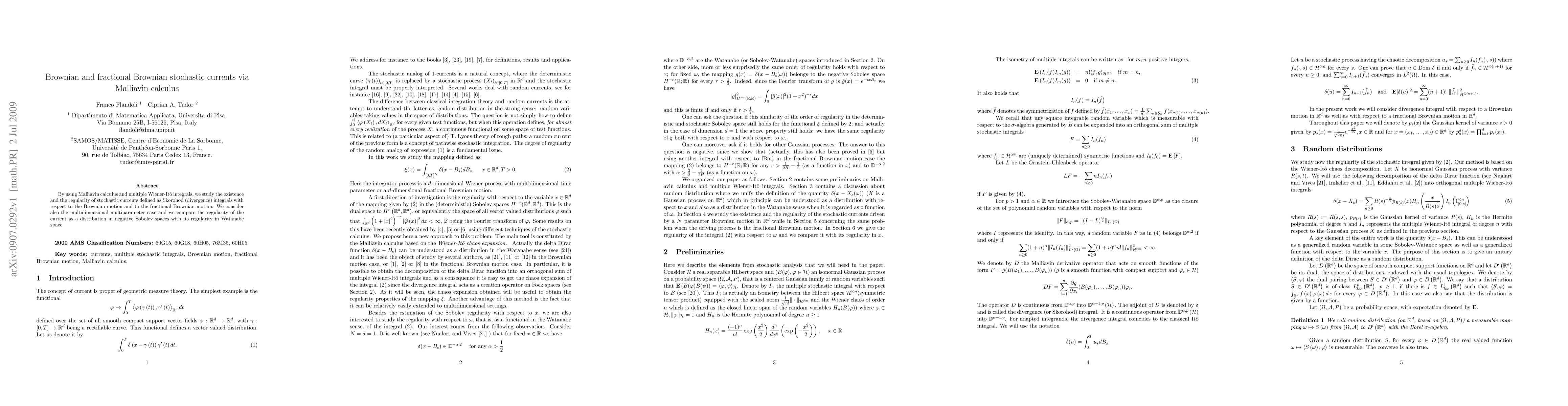 This paper employs Malliavin calculus to investigate the existence and regularity of stochastic currents defined via Skorohod integrals with respect to Brownian and fractional Brownian motions. It also examines the multidimensional case and compares the current's regularity in negative Sobolev spaces versus Watanabe space.