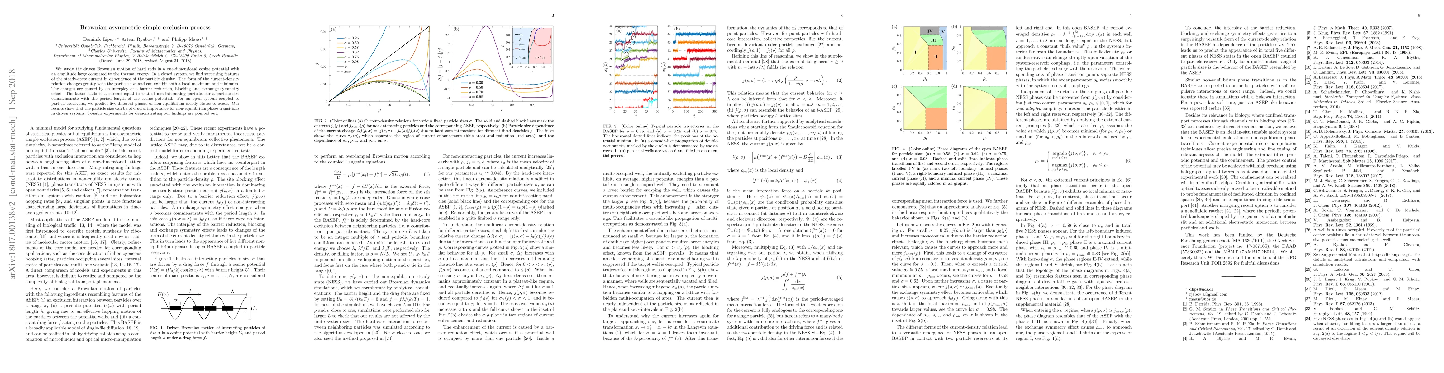 We study the driven Brownian motion of hard rods in a one-dimensional cosine potential with an amplitude large compared to the thermal energy. In a closed system, we find surprising features of the steady-state current in dependence of the particle density. The form of the current-density relation changes greatly with the particle size and can exhibit both a local maximum and minimum. The changes are caused by an interplay of a barrier reduction, blocking and exchange symmetry effect. The latter leads to a current equal to that of non-interacting particles for a particle size commensurate with the period length of the cosine potential. For an open system coupled to particle reservoirs, we predict five different phases of non-equilibrium steady states to occur. Our results show that the particle size can be of crucial importance for non-equilibrium phase transitions in driven systems. Possible experiments for demonstrating our findings are pointed out.