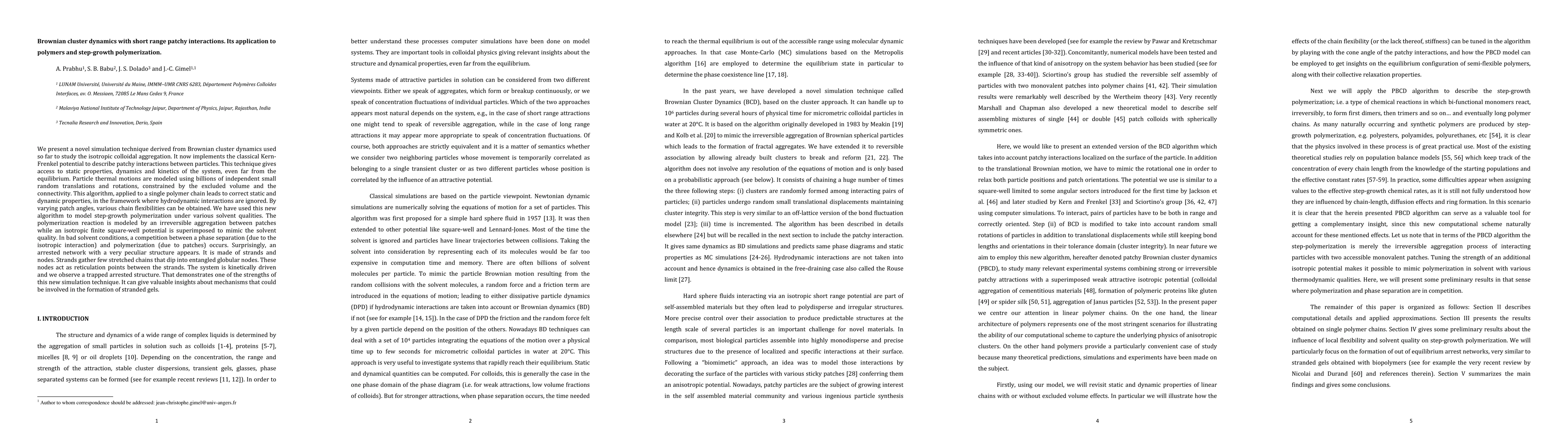 We present a novel simulation technique derived from Brownian cluster dynamics used so far to study the isotropic colloidal aggregation. It now implements the classical Kern-Frenkel potential to describe patchy interactions between particles. This technique gives access to static properties, dynamics and kinetics of the system, even far from the equilibrium. Particle thermal motions are modeled using billions of independent small random translations and rotations, constrained by the excluded volume and the connectivity. This algorithm, applied to a single polymer chain leads to correct static and dynamic properties, in the framework where hydrodynamic interactions are ignored. By varying patch angles, various chain flexibilities can be obtained. We have used this new algorithm to model step-growth polymerization under various solvent qualities. The polymerization reaction is modeled by an irreversible aggregation between patches while an isotropic finite square-well potential is superimposed to mimic the solvent quality. In bad solvent conditions, a competition between a phase separation (due to the isotropic interaction) and polymerization (due to patches) occurs. Surprisingly, an arrested network with a very peculiar structure appears. It is made of strands and nodes. Strands gather few stretched chains that dip into entangled globular nodes. These nodes act as reticulation points between the strands. The system is kinetically driven and we observe a trapped arrested structure. That demonstrates one of the strengths of this new simulation technique. It can give valuable insights about mechanisms that could be involved in the formation of stranded gels.