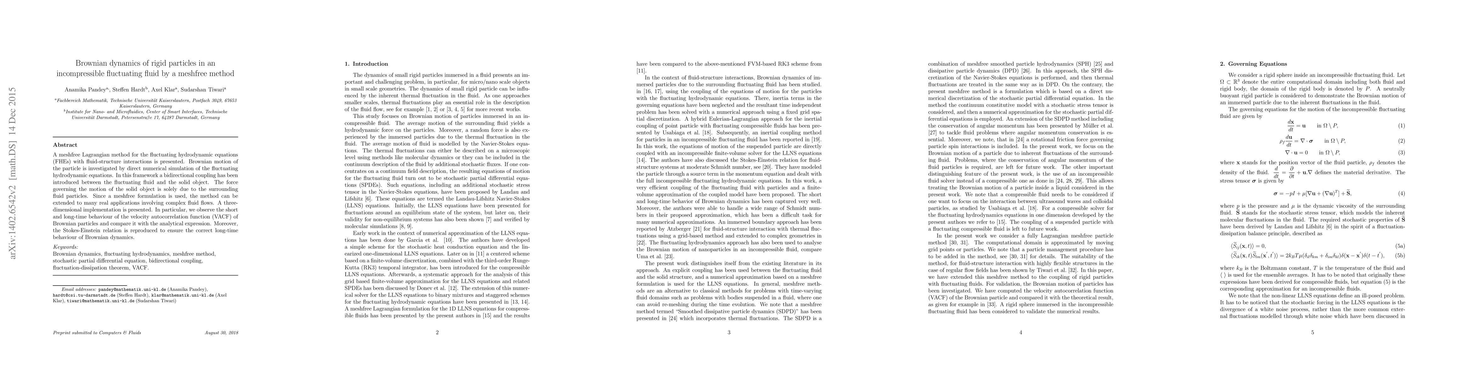 This paper presents a meshfree Lagrangian method for simulating Brownian dynamics of rigid particles in an incompressible fluctuating fluid, focusing on bidirectional fluid-structure interactions. The method accurately reproduces the short and long-time behavior of the velocity autocorrelation function and validates the Stokes-Einstein relation.
