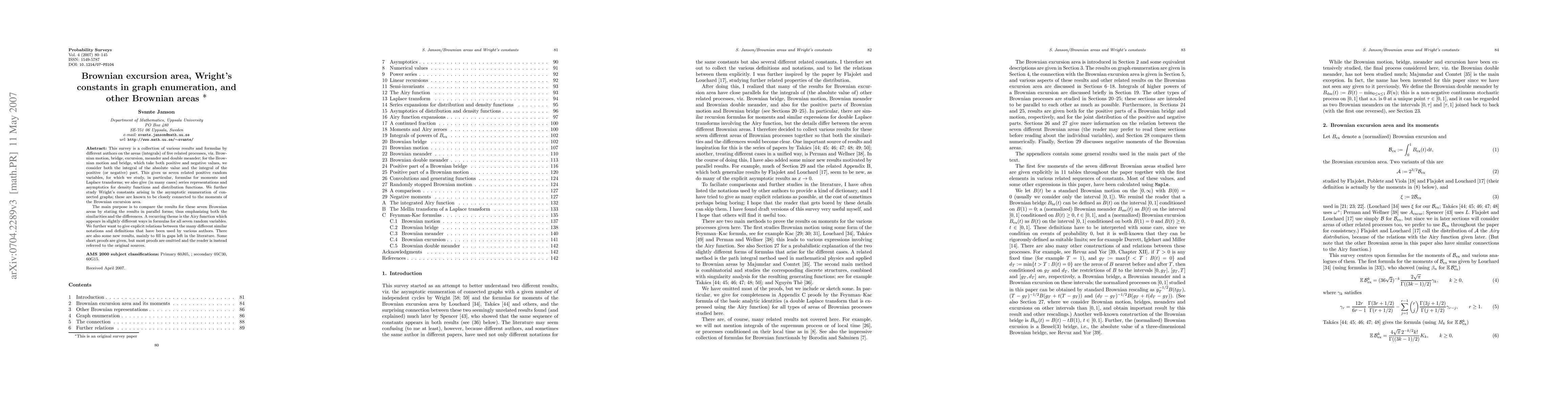 The research methodology involves a comprehensive survey of various results and formulas related to seven Brownian processes: Brownian motion, bridge, excursion, meander, and double meander. It also explores Wright's constants in graph enumeration, closely connected to the moments of the Brownian excursion area.