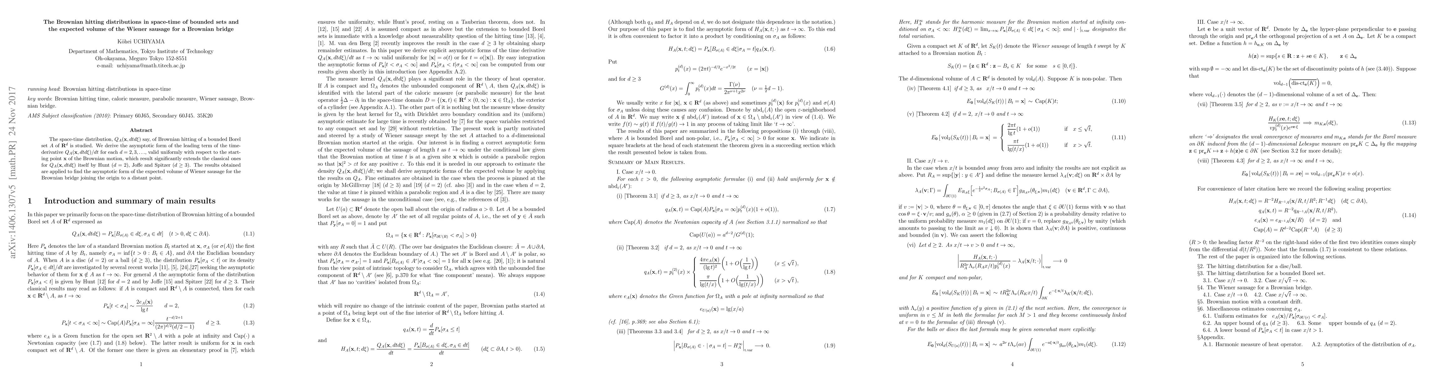 The space-time distribution, $Q_A(x,dt d\xi)$ say, of Brownian hitting of a bounded Borel set $A$ of the $d$-dimensional Euclidian space is studied. We derive the asymptotic form of the leading term of the time-derivative $Q_A(x, dtd\xi)/dt$ for each $d =2, 3, ...$, valid uniformly with respect to the starting point $x$ of the Brownian motion, which result extends significantly the classical results for $Q_A(x, dt d\xi)$ itself by Hunt ($d=2$), Joffe and Spitzer ($d= 3, 4,...$). The results are applied to find the asymptotic form of the expected volume of Wiener sausage for the Brownian bridge joining the origin to a distant point.