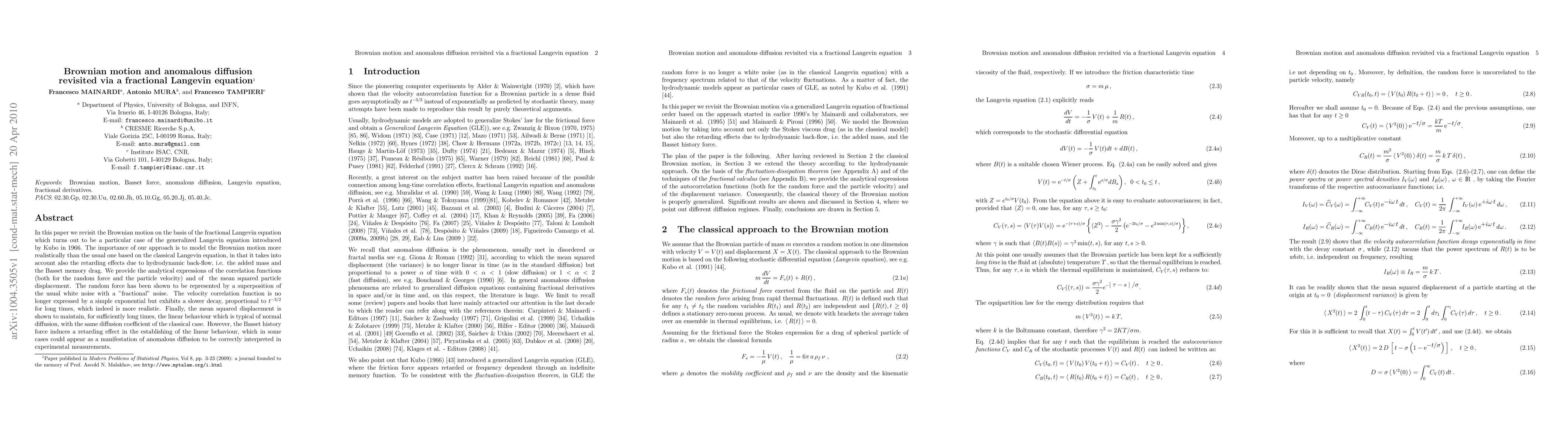 This paper models Brownian motion using a fractional Langevin equation, capturing hydrodynamic effects like added mass and Basset memory drag. It provides analytical expressions for correlation functions and mean squared displacement, showing a slower decay in velocity correlation and a potential manifestation of anomalous diffusion due to the Basset history force.