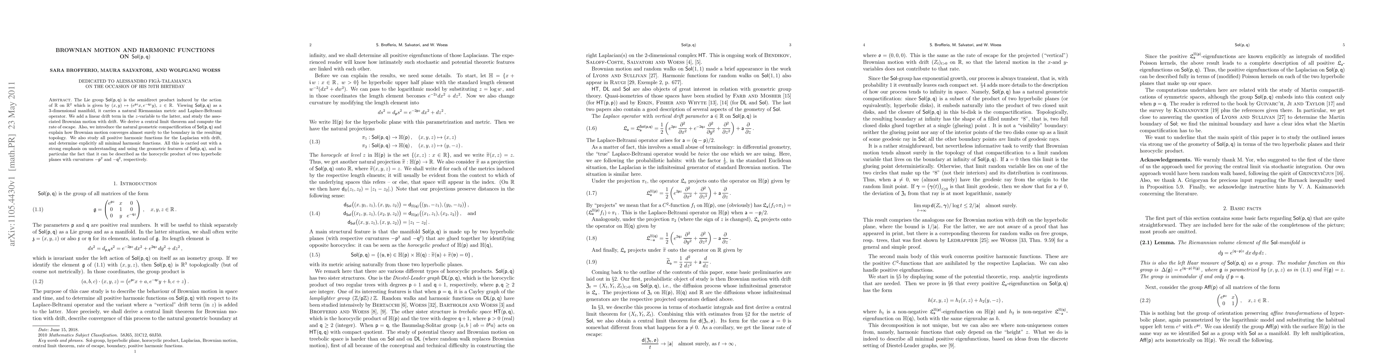 This paper studies Brownian motion on Sol(p,q), a 3D manifold with a natural Riemannian metric, and derives a central limit theorem and the rate of escape. It also explores harmonic functions and their convergence to the boundary.