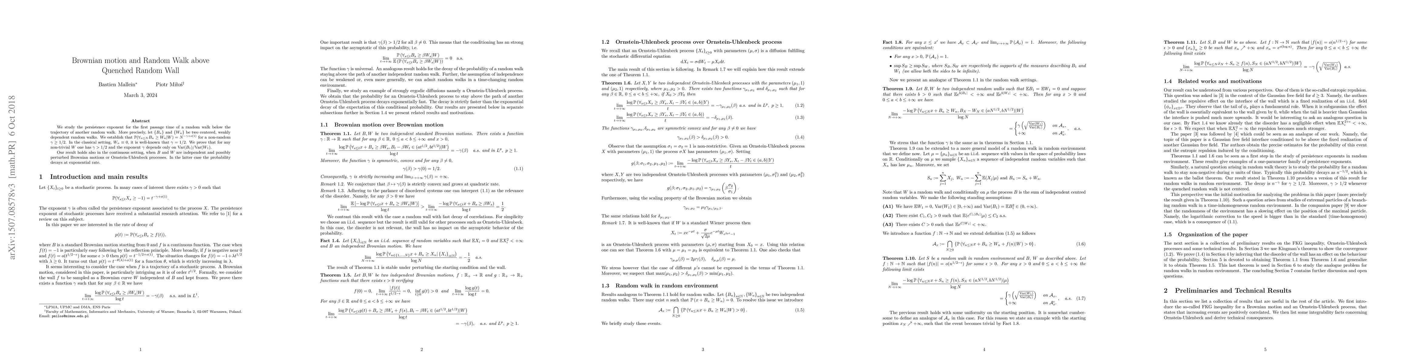 We study the persistence exponent for the first passage time of a random walk below the trajectory of another random walk. More precisely, let $\{B_n\}$ and $\{W_n\}$ be two centered, weakly dependent random walks. We establish that $\mathbb{P}(\forall_{n\leq N} B_n \geq W_n|W) = N^{-\gamma + o(1)}$ for a non-random $\gamma\geq 1/2$. In the classical setting, $W_n \equiv 0$, it is well-known that $\gamma = 1/2$. We prove that for any non-trivial $W$ one has $\gamma>1/2$ and the exponent $\gamma$ depends only on $\text{Var}(B_1)/\text{Var}(W_1)$. Our result holds also in the continuous setting, when $B$ and $W$ are independent and possibly perturbed Brownian motions or Ornstein-Uhlenbeck processes. In the latter case the probability decays at exponential rate.