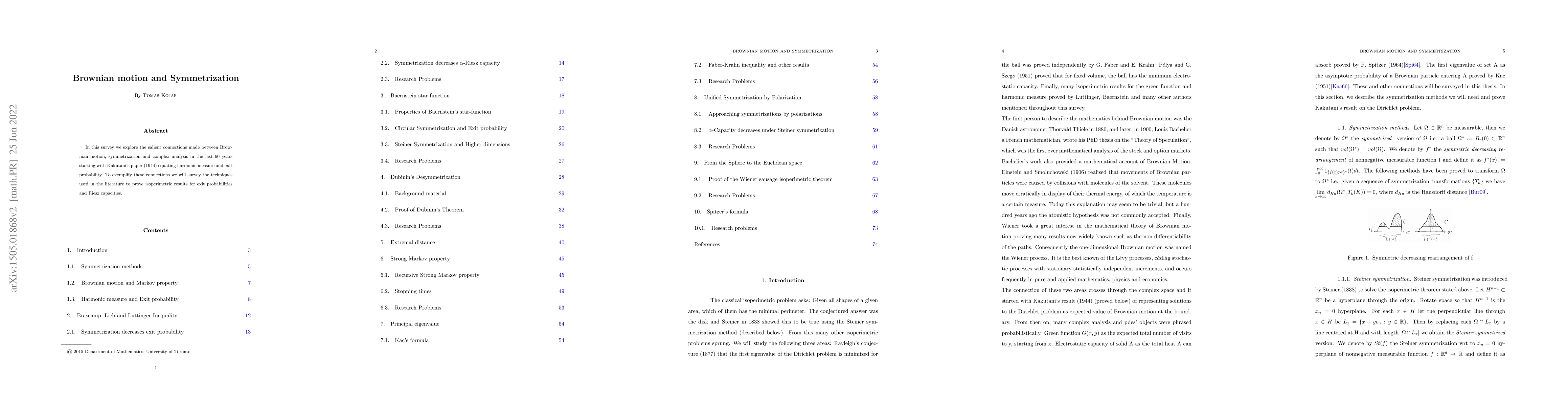 This paper surveys the historical and technical connections between Brownian motion, symmetrization, and complex analysis, highlighting the evolution from Kakutani's 1944 work on harmonic measure to modern isoperimetric results for exit probabilities and Riesz capacities.
