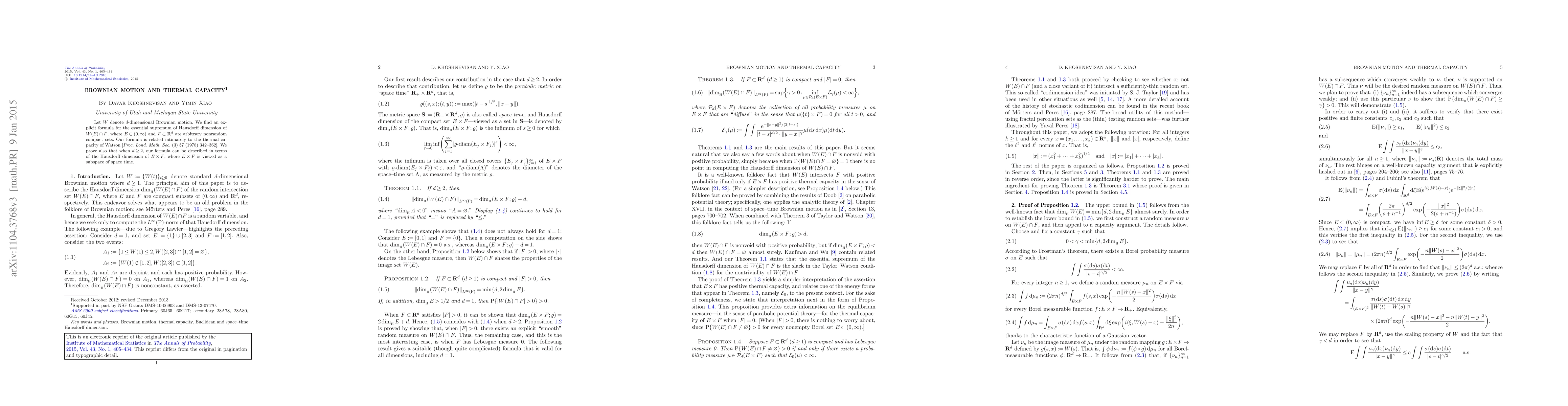 This paper derives an explicit formula for the essential supremum of Hausdorff dimension of intersections between a $d$-dimensional Brownian motion trajectory and arbitrary nonrandom compact sets, linking this result to Watson's thermal capacity. It further demonstrates that for $d\ge2$, this formula can be expressed in terms of the Hausdorff dimension of the product space of the sets.