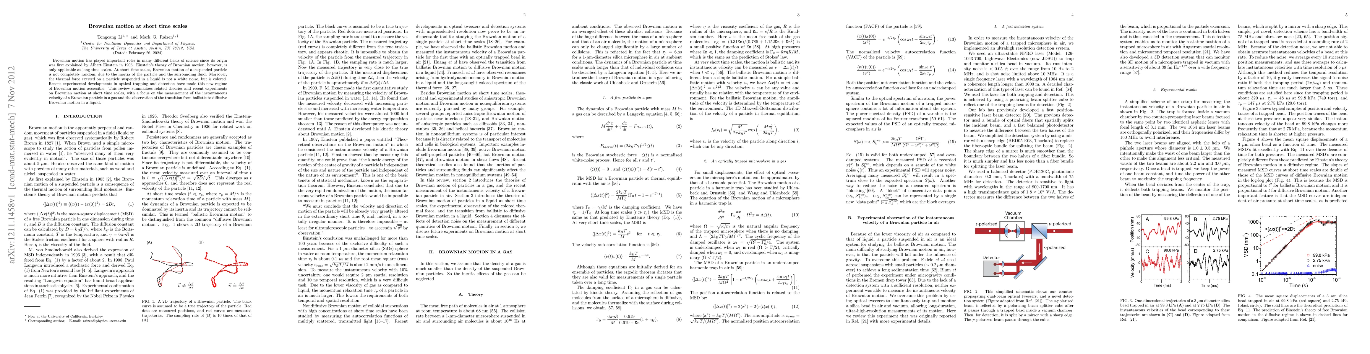 This paper reviews theories and experiments on Brownian motion at short time scales, highlighting the transition from ballistic to diffusive motion due to particle inertia and colored thermal forces, enabled by advancements in optical trapping and detection. It focuses on the measurement of instantaneous velocity in gases and the dynamics in liquids.