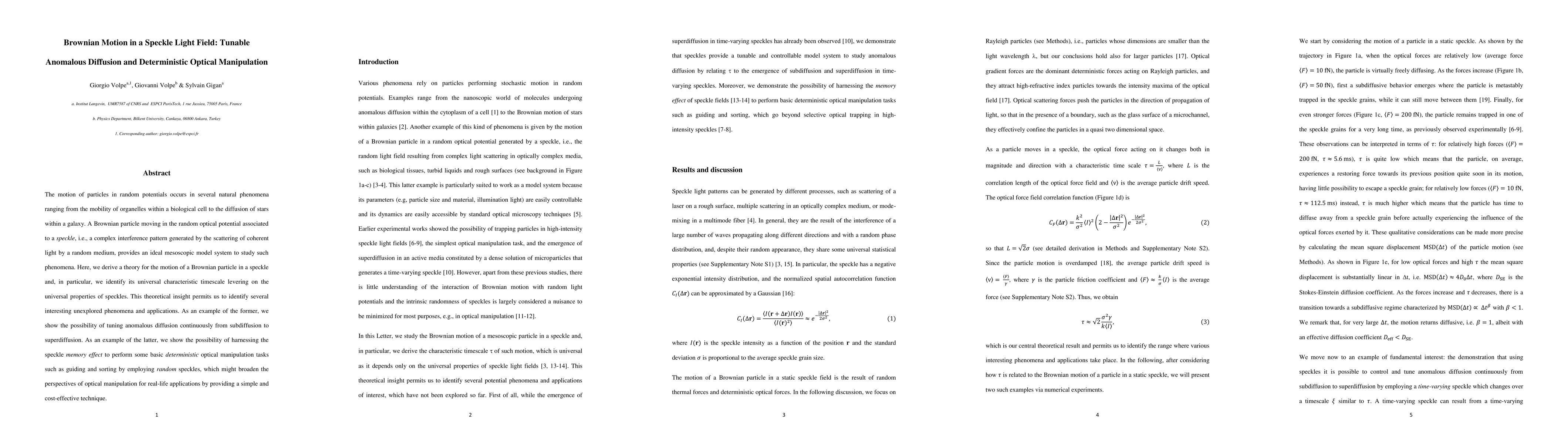The motion of particles in random potentials occurs in several natural phenomena ranging from the mobility of organelles within a biological cell to the diffusion of stars within a galaxy. A Brownian particle moving in the random optical potential associated to a speckle, i.e., a complex interference pattern generated by the scattering of coherent light by a random medium, provides an ideal mesoscopic model system to study such phenomena. Here, we derive a theory for the motion of a Brownian particle in a speckle and, in particular, we identify its universal characteristic timescale levering on the universal properties of speckles. This theoretical insight permits us to identify several interesting unexplored phenomena and applications. As an example of the former, we show the possibility of tuning anomalous diffusion continuously from subdiffusion to superdiffusion. As an example of the latter, we show the possibility of harnessing the speckle memory effect to perform some basic deterministic optical manipulation tasks such as guiding and sorting by employing random speckles, which might broaden the perspectives of optical manipulation for real-life applications by providing a simple and cost-effective technique.