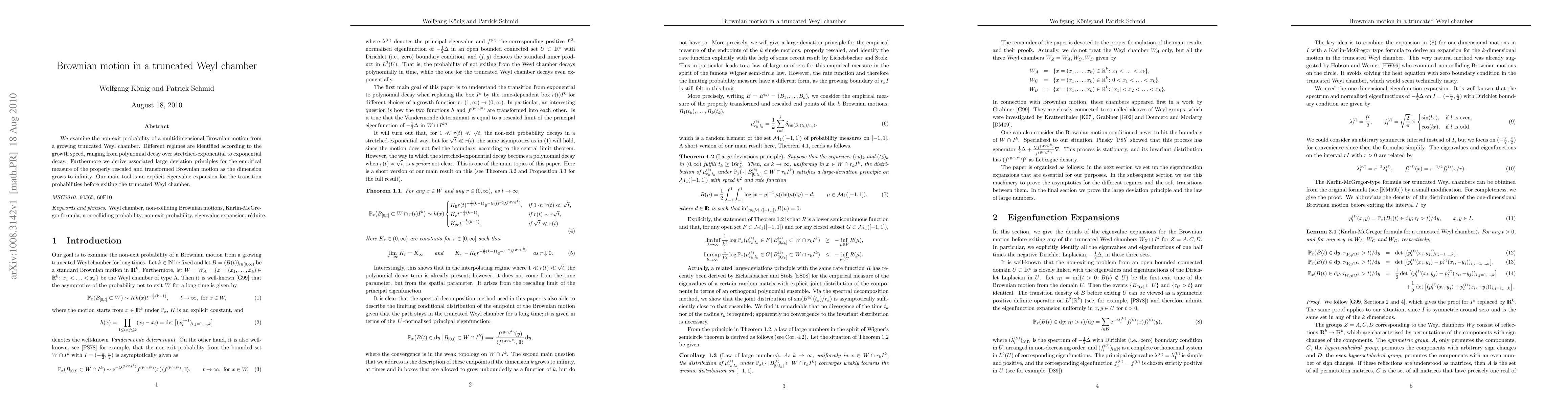 We examine the non-exit probability of a multidimensional Brownian motion from a growing truncated Weyl chamber. Different regimes are identified according to the growth speed, ranging from polynomial decay over stretched-exponential to exponential decay. Furthermore we derive associated large deviation principles for the empirical measure of the properly rescaled and transformed Brownian motion as the dimension grows to infinity. Our main tool is an explicit eigenvalue expansion for the transition probabilities before exiting the truncated Weyl chamber.
