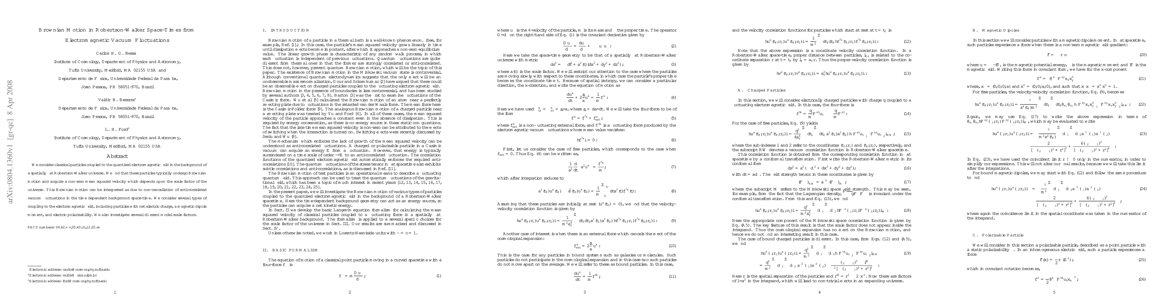 We consider classical particles coupled to the quantized electromagnetic field in the background of a spatially flat Robertson-Walker universe. We find that these particles typically undergo Brownian motion and acquire a non-zero mean squared velocity which depends upon the scale factor of the universe. This Brownian motion can be interpreted as due to non-cancellation of anti-correlated vacuum fluctuations in the time dependent background space-time. We consider several types of coupling to the electromagnetic field, including particles with net electric charge, a magnetic dipole moment, and electric polarizability. We also investigate several different model scale factors.