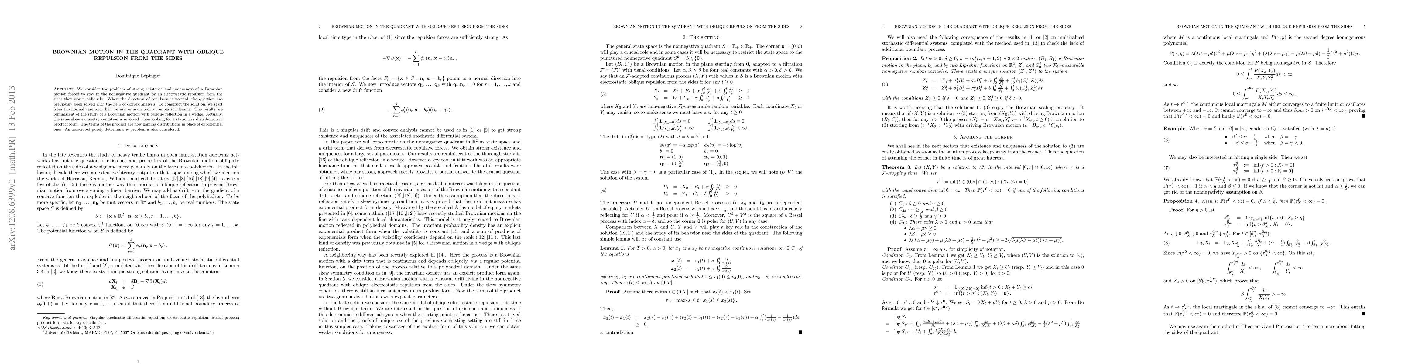 We consider the problem of strong existence and uniqueness of a Brownian motion forced to stay in the quadrant by an electrostatic repulsion from the sides that works obliquely. The results are reminiscent of the study of a Brownian motion with oblique reflection in a wedge. Actually, the same skew symmetry condition is involved when looking for a stationary distribution in product form. the terms of the product are now gamma distributions in place of exponential ones. An associate purely deterministic problem is also considered.