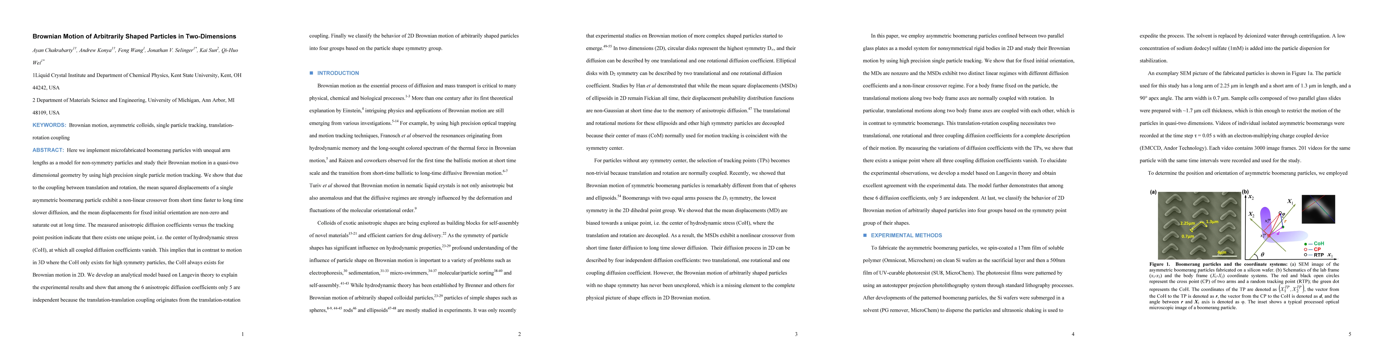 This paper investigates the Brownian motion of microfabricated boomerang particles in two dimensions, revealing a non-linear crossover in diffusion rates and the existence of a unique center of hydrodynamic stress (CoH) where all coupled diffusion coefficients vanish. The study categorizes 2D Brownian motion of asymmetric particles into four groups based on their shape symmetry.